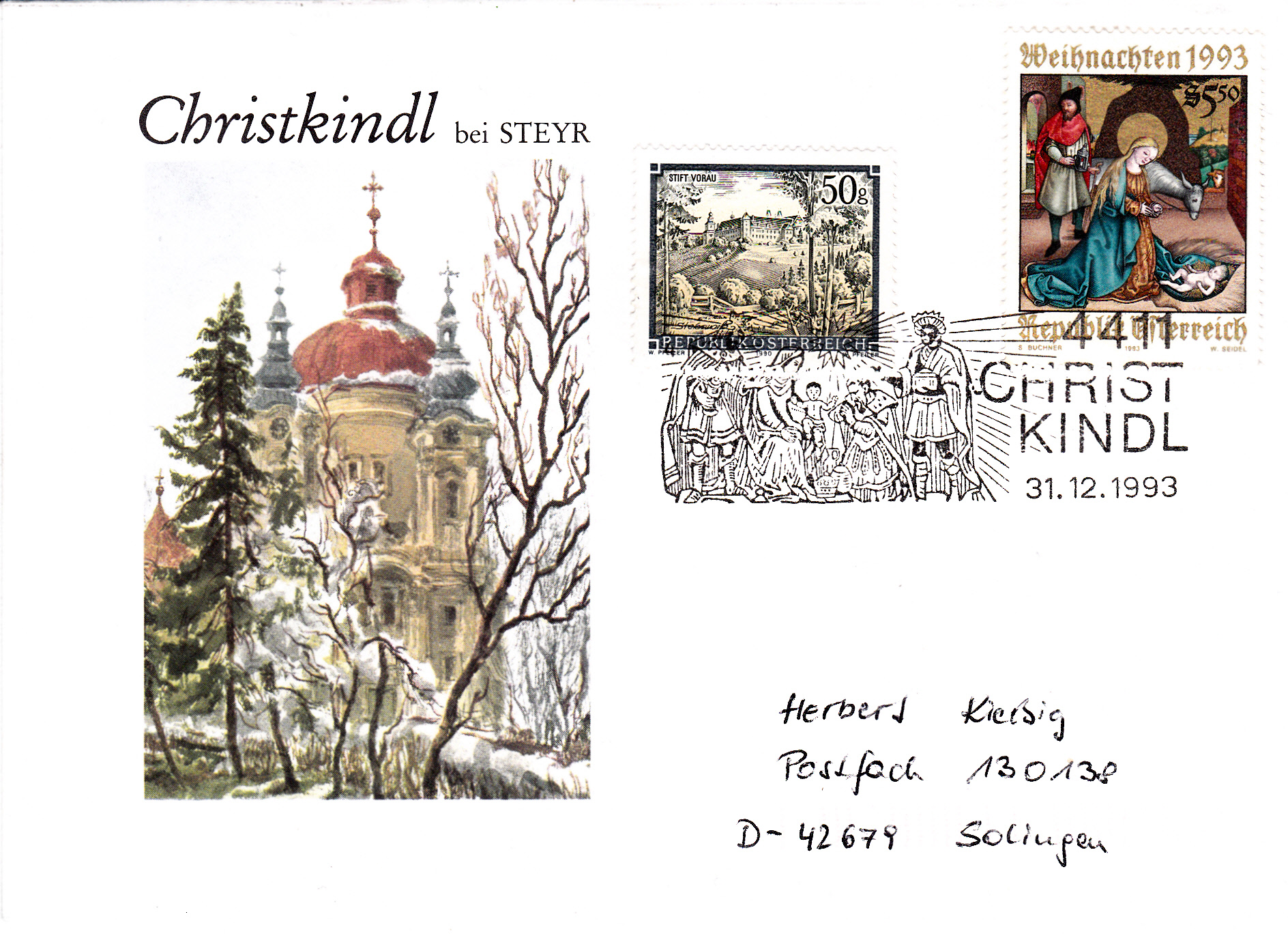 Im Sonderstempel von Christkindl vom 27.12.1993 (Laufzeit bis 6.1.1994) huldigen die drei Weisen aus dem Morgenlande dem Jususkind und bringen ihm ihre Gaben. Es gibt den Stempel wie in Österreich üblich mit verschiedenen Kennziffern von 1 bis x (Anzahl der insgesamt verwendeten Stempelplatten)