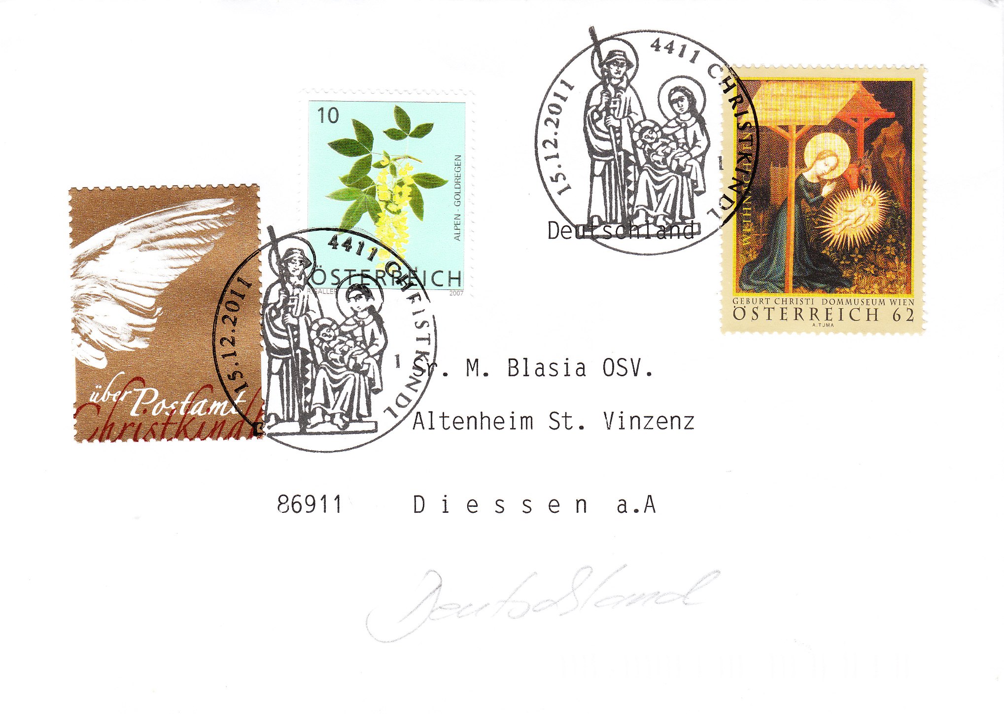 Brief mit Leitzettel "über Postamt Christkindl" aus dem Jahre 2011: