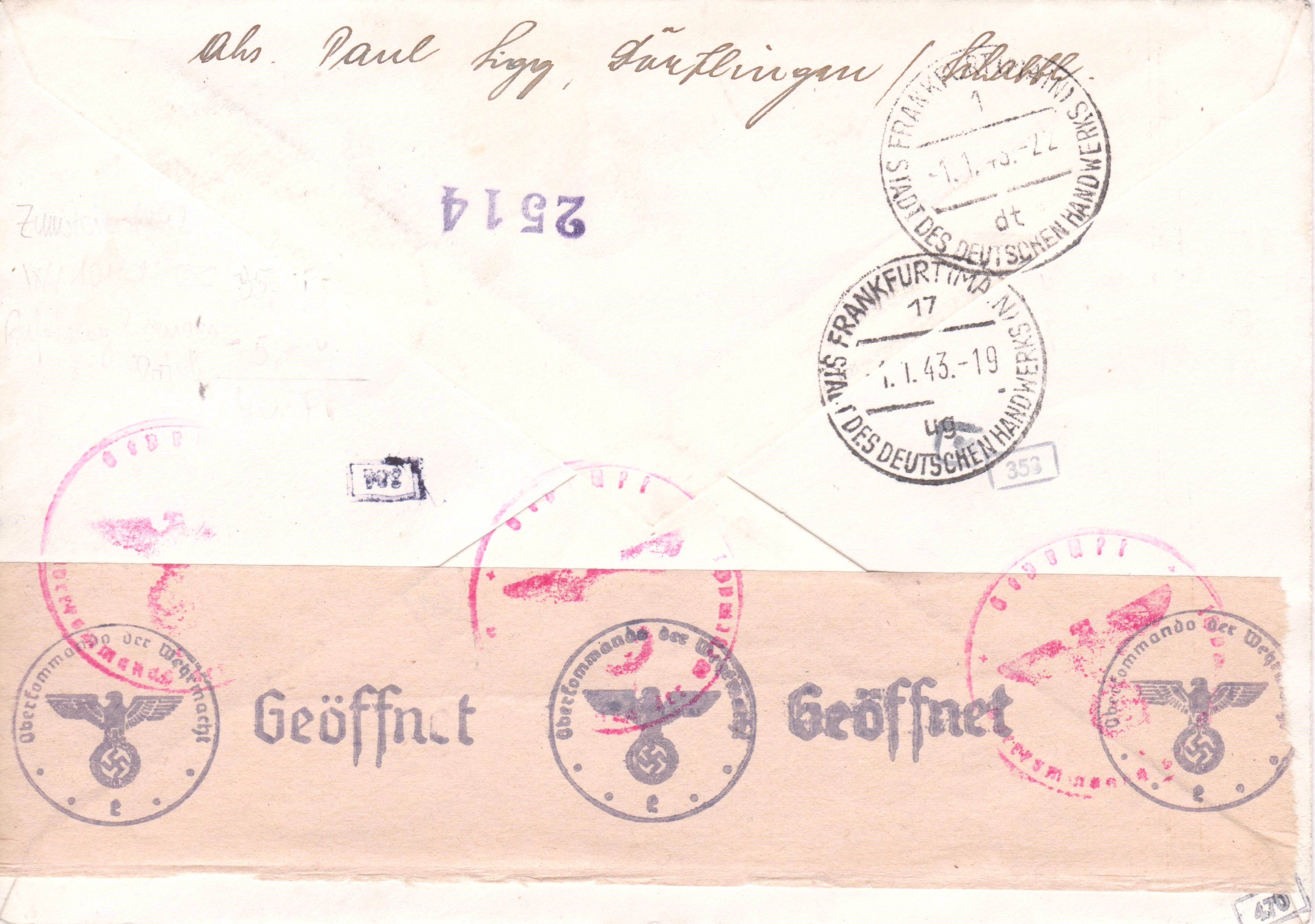 Dieser Brief per Einschreiben aus der Schweiz kam am 01.01.1943 an seinem Bestimmungsort Frankfurt am Main an und erhielt rückseitig zwei Tagesstempel als Ankunftstempel: