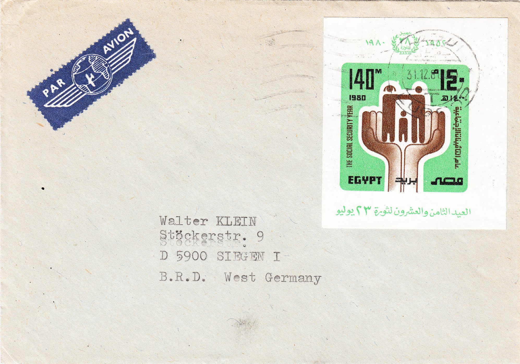 Dieser Brief mit einer Blockfrankatur wurde am 31.12.1980 in Ägypten aufgegeben: