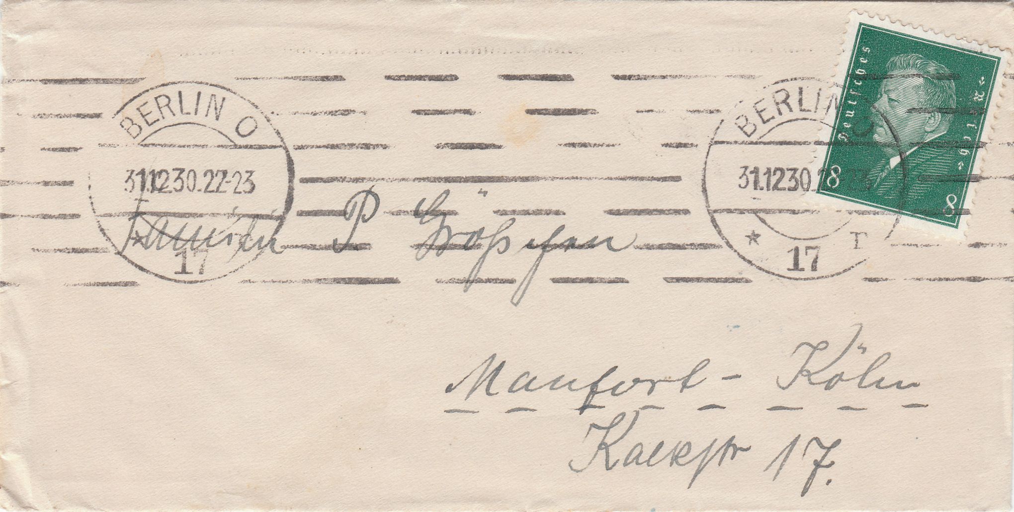 Dieser nach "Manfort-Köln" adressierte Beleg wurde am 31.12.1930 in Berlin aufgegeben: