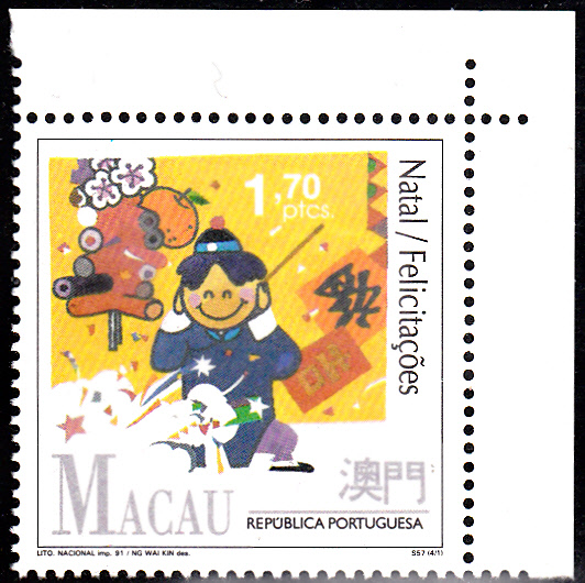 Hier eine Marke aus Macau (MiNr 686) aus einer Serie "Weihnachten und Neujahr". Die Marke zeigt ein Kind mit Silvesterkrachern.