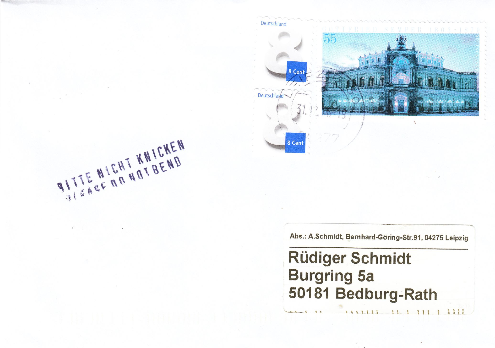 Als Frankatur diente eine Mischfrankatur bestehend aus einer Sondermarke mit dem Motiv der Semperoper in Dresden sowie zwei selbstklebenden Ergänzungsmarken der Wertstufe zu 8 Cent, womit der Beleg als Standardbrief der Portostufe 70 Cent um einen Cent überfrankiert ist.