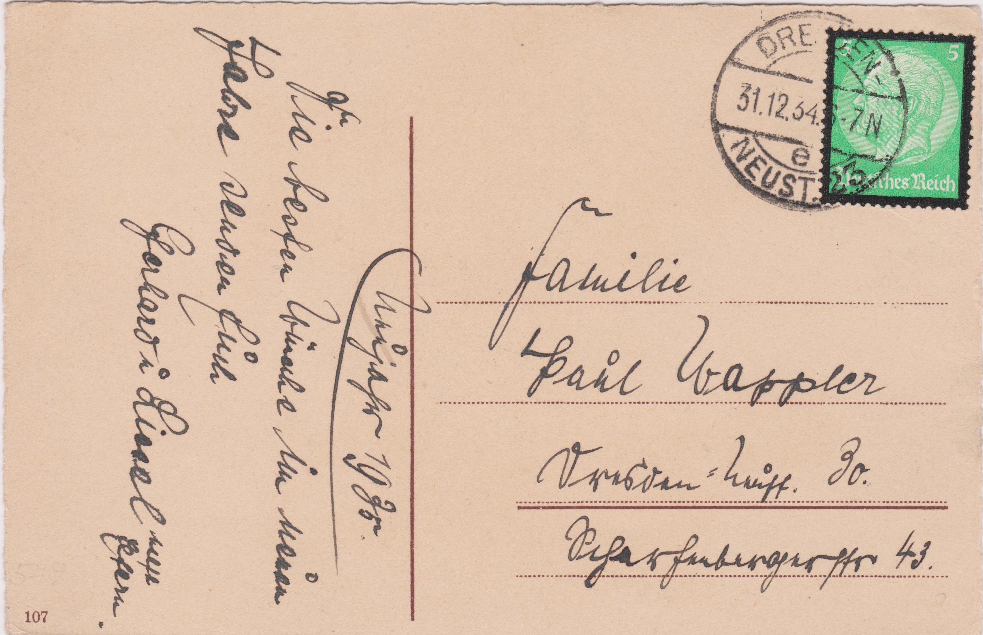 Postkarte im Ortsverkehr von Dresden, mit 5 Pf portorichtig frankiert, aufgegeben am 31.12.1934: