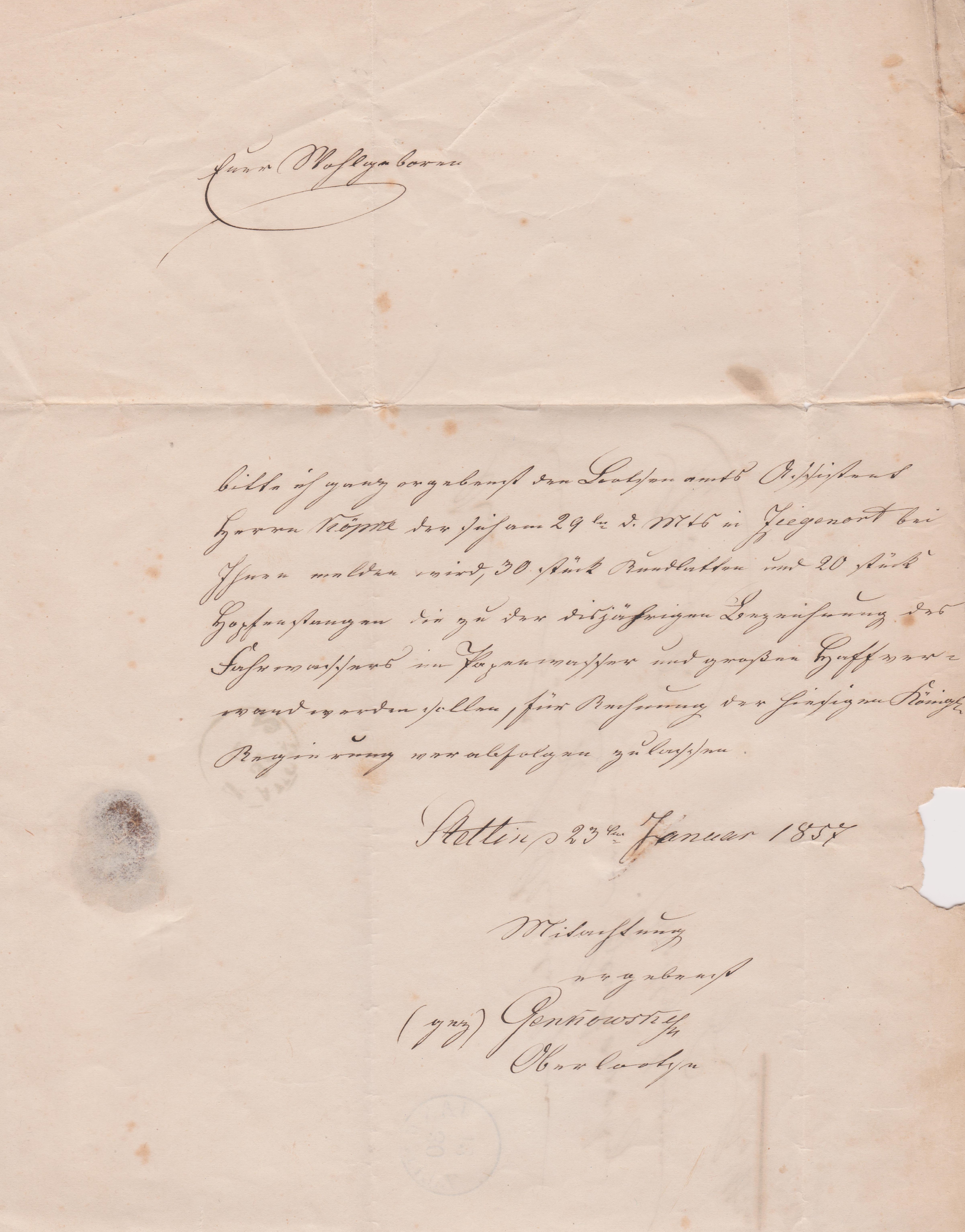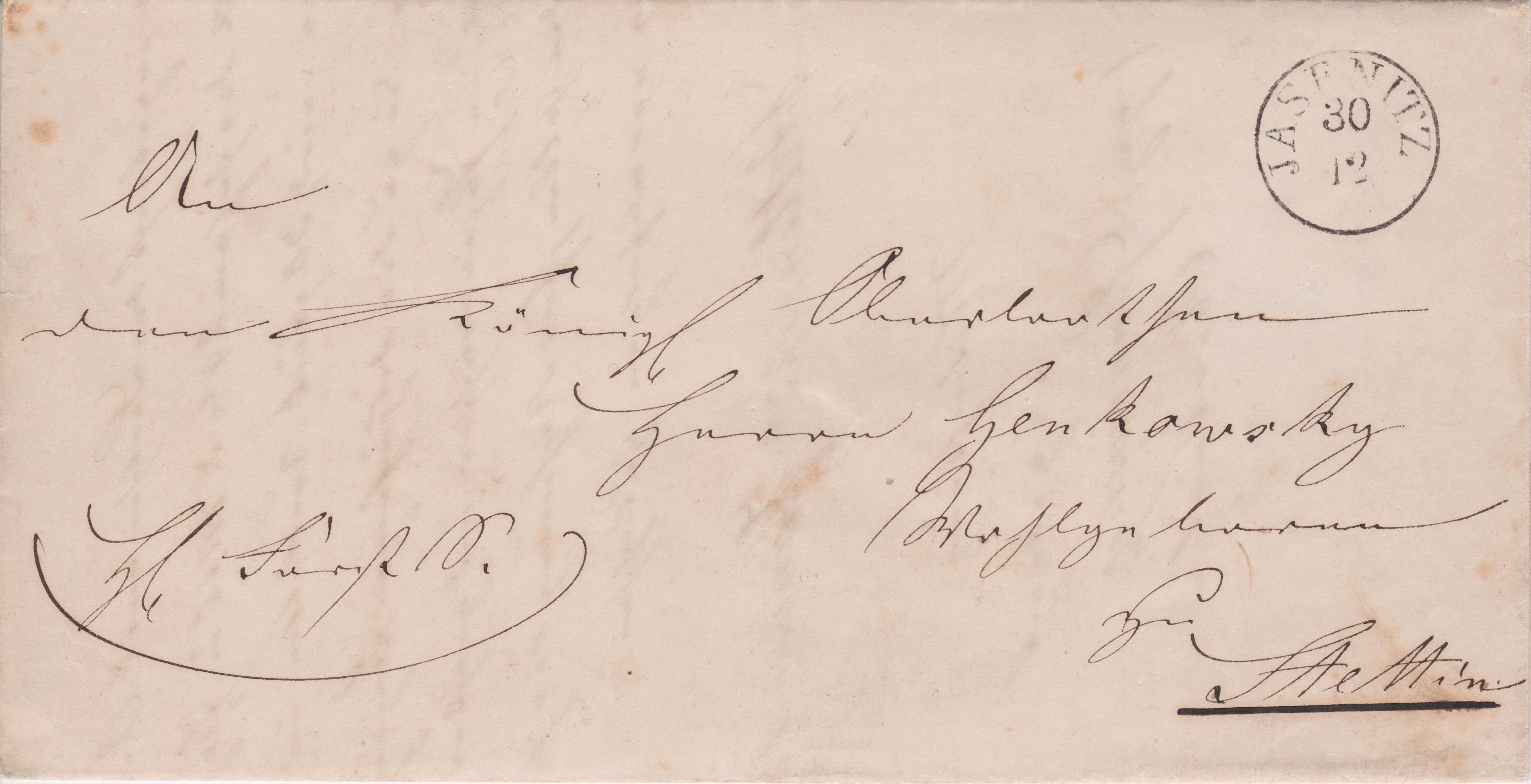 Brief, aufgegeben am 30.12.1856 in JASENITZ in Pommern, adressiert nach Stettin: