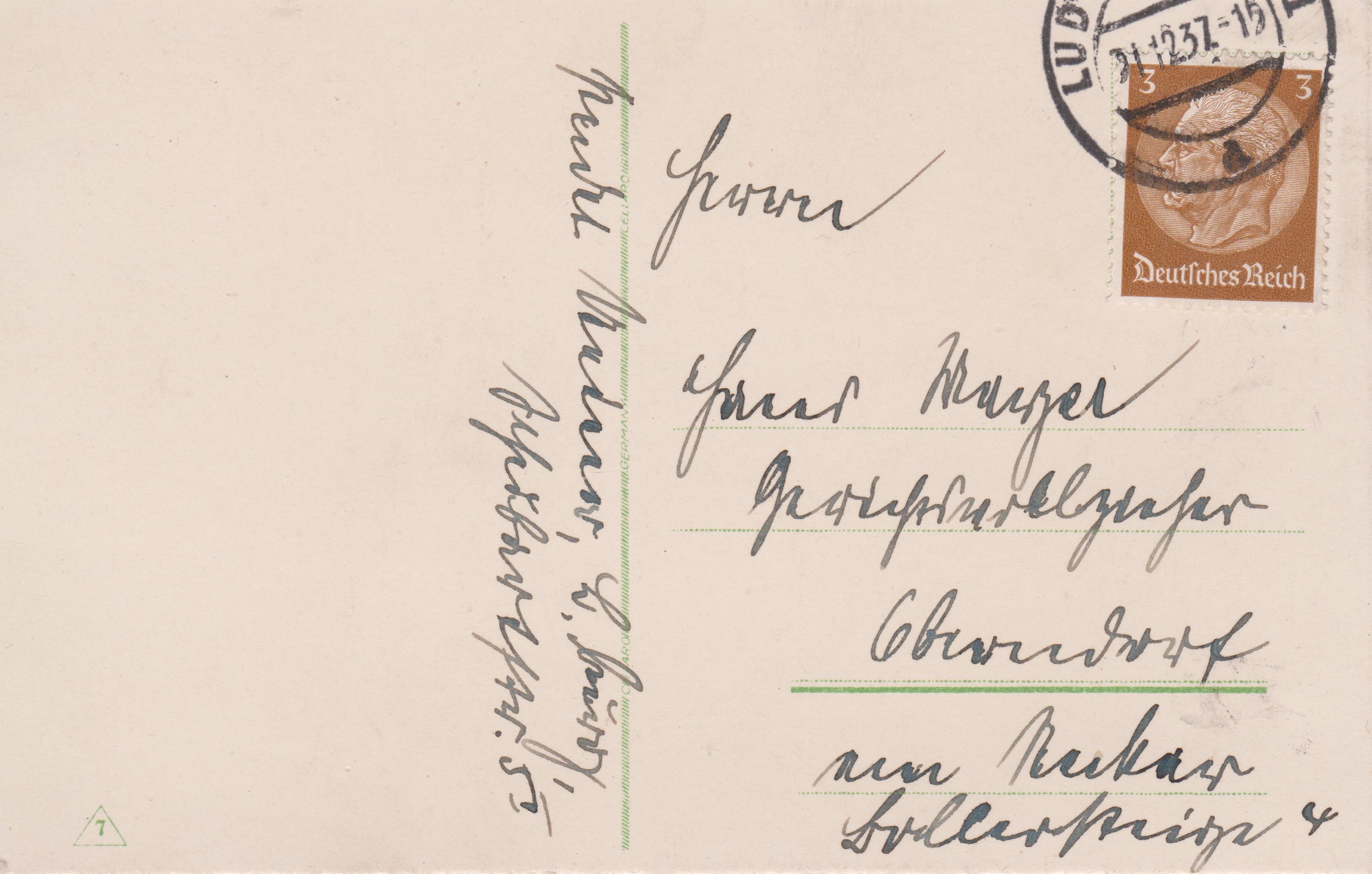 Diese Ansichtskarte "Herzlichen Glückwunsch zum neuen Jahre" wurde am 31.12.1937 (= Silvester) aufgegeben: