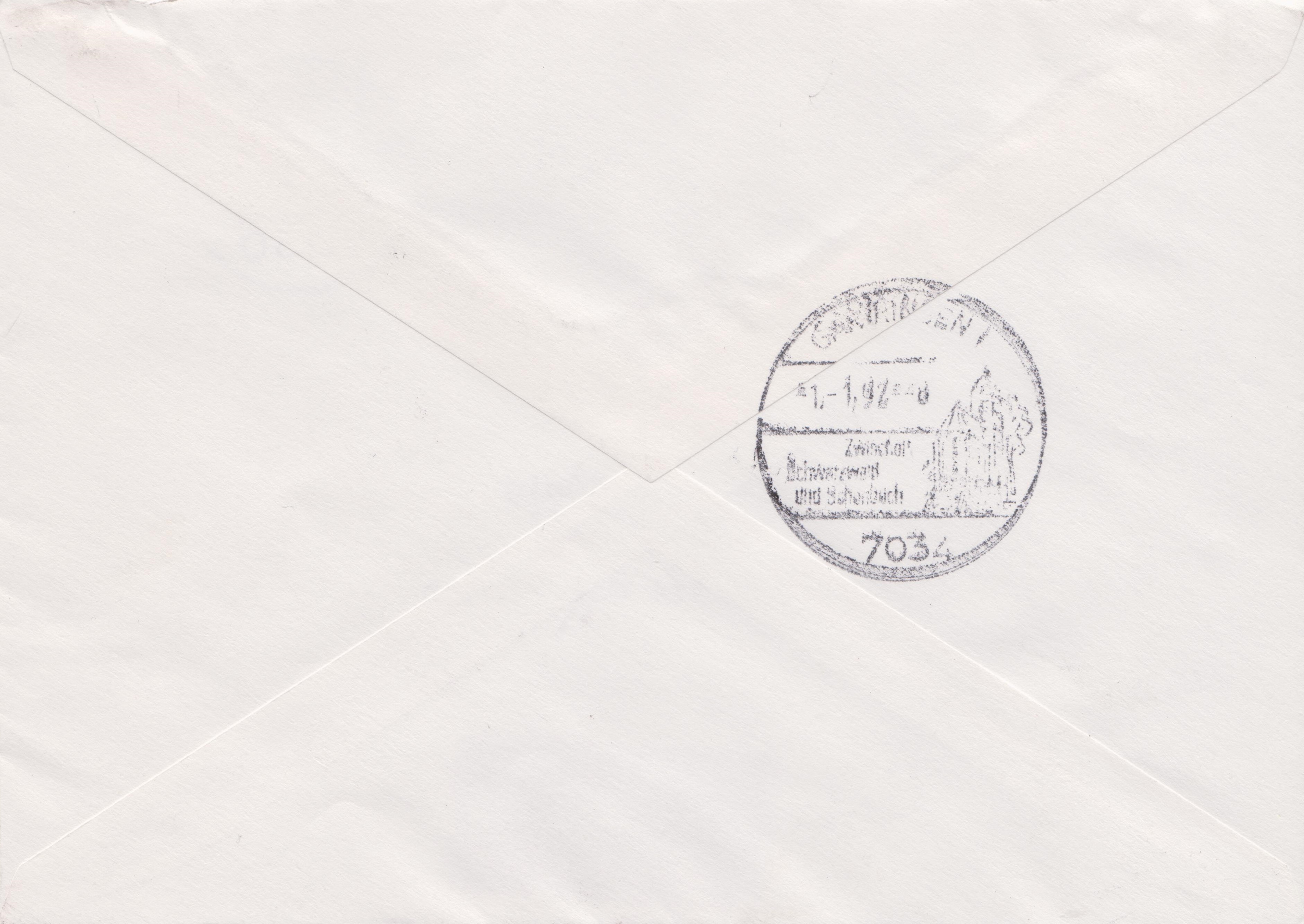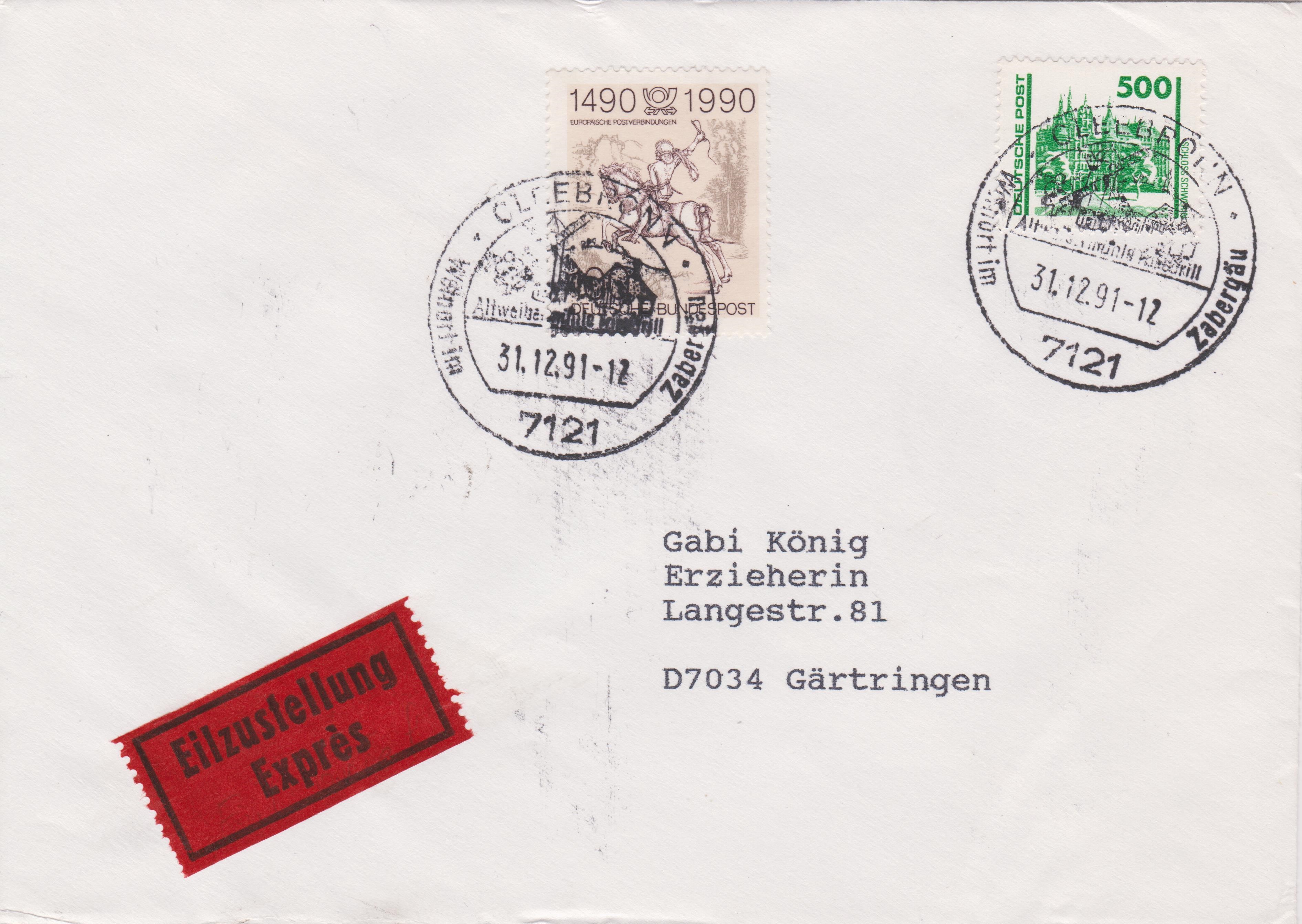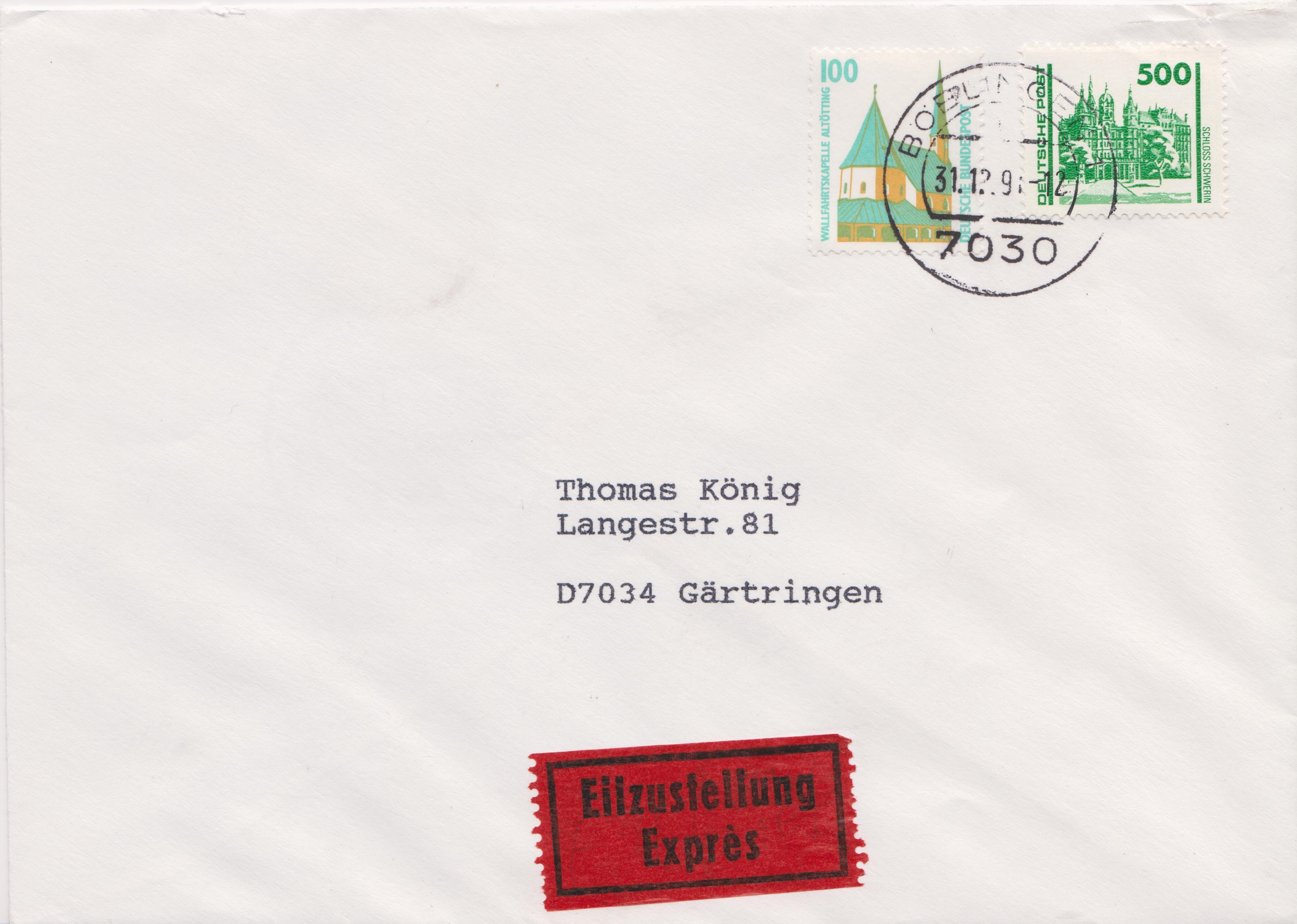 Briefe per Eilzustellung, Portostufe 600 Pf, gelaufen am 31.12.1991 nach 7034 Gärtringen:
