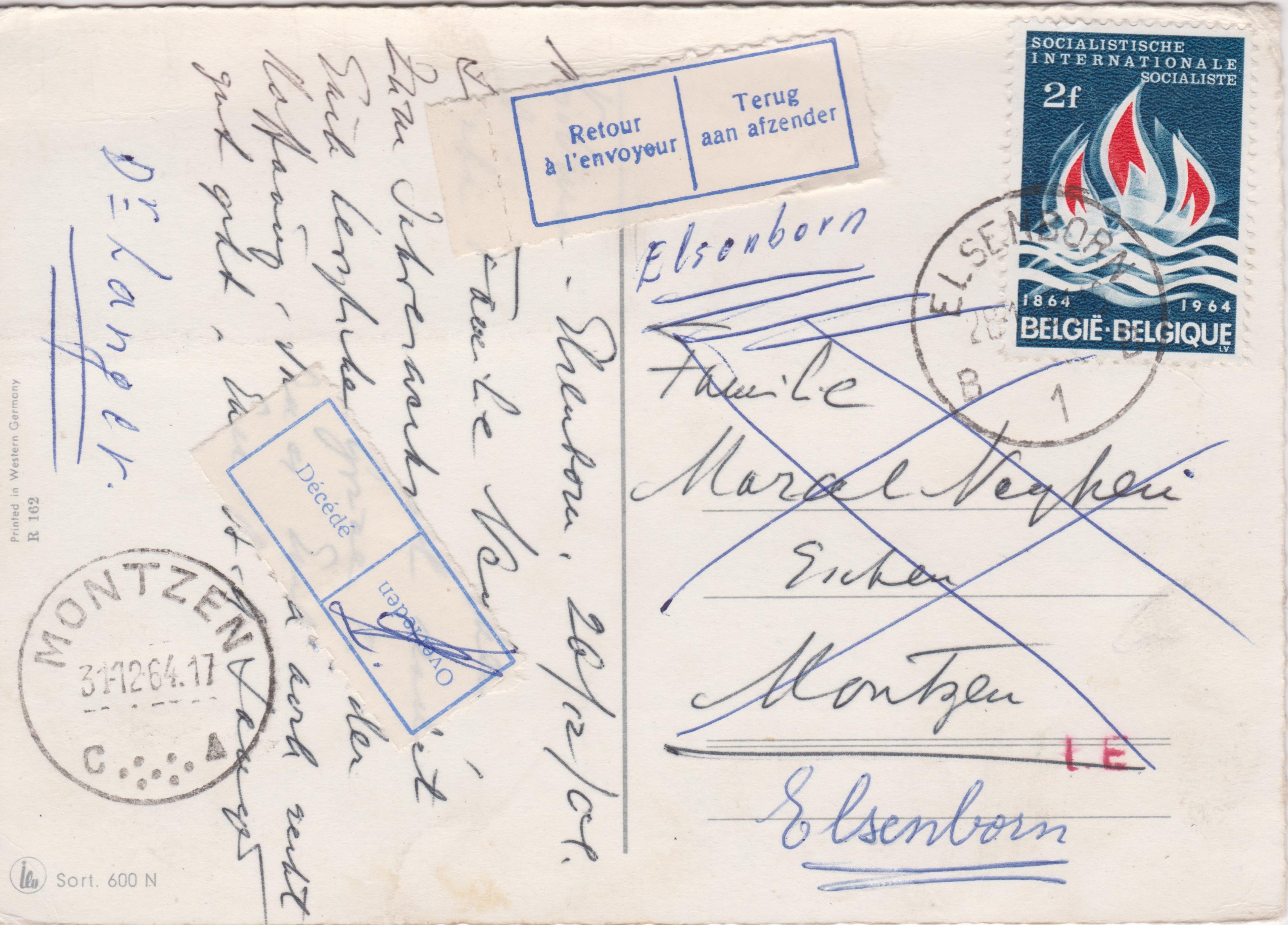 Diese nach Montzen adressierte Postkarte kam dort am 31.12.1964 um 17 Uhr an und ging dann an den Aufgabeort "Elsenborn" zurück :
