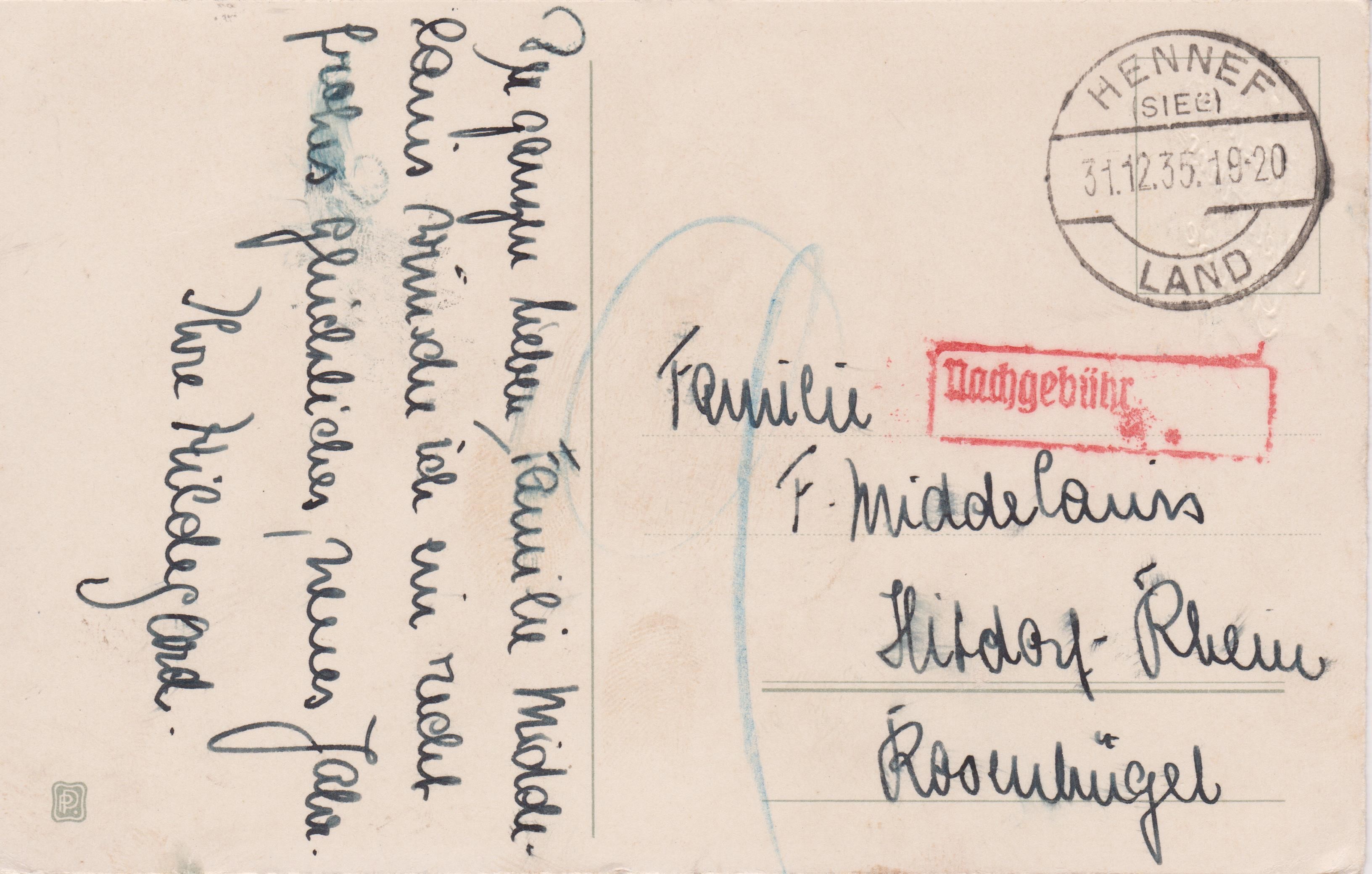 Diese nach "Hitdorf-Rhein" adressierte Postkarte wurde am 31.12.1935 unfrankiert in HENNEF (SIEG) LAND aufgegeben: