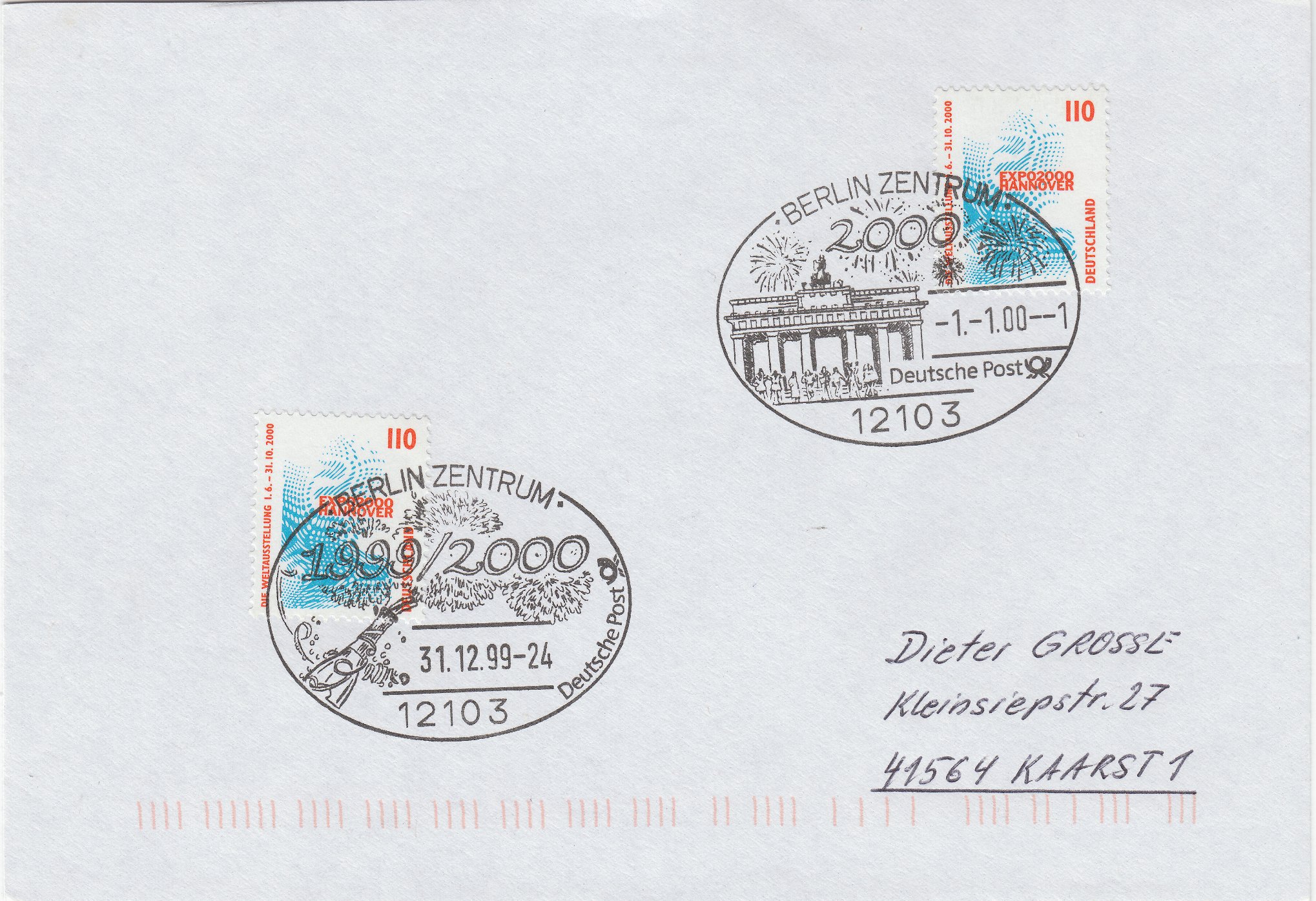 Hier eine Anschriftenprüfung, aufgegeben am 31.12.2000 um Mitternacht in BERLIN ZENTRUM und dementsprechend entwertet mit dem Handwerbestempel "Silvester 2000", der das zu dieser Zeit laufende Feuerwerk am Himmel über der Gedächtniskirche illustriert: