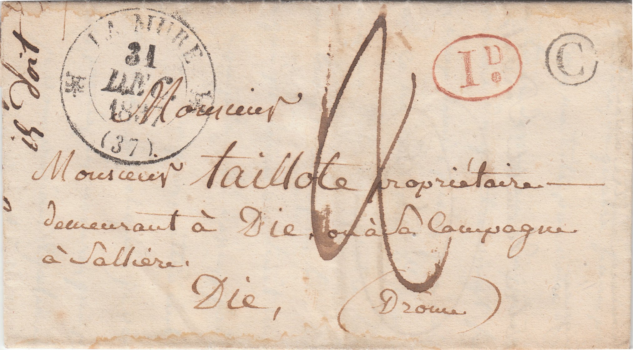 Dieser nach DIE im Département Drôme adressierte Brief wurde am 31.12.1837 in der französischen Stadt LA NURE aufgegeben: