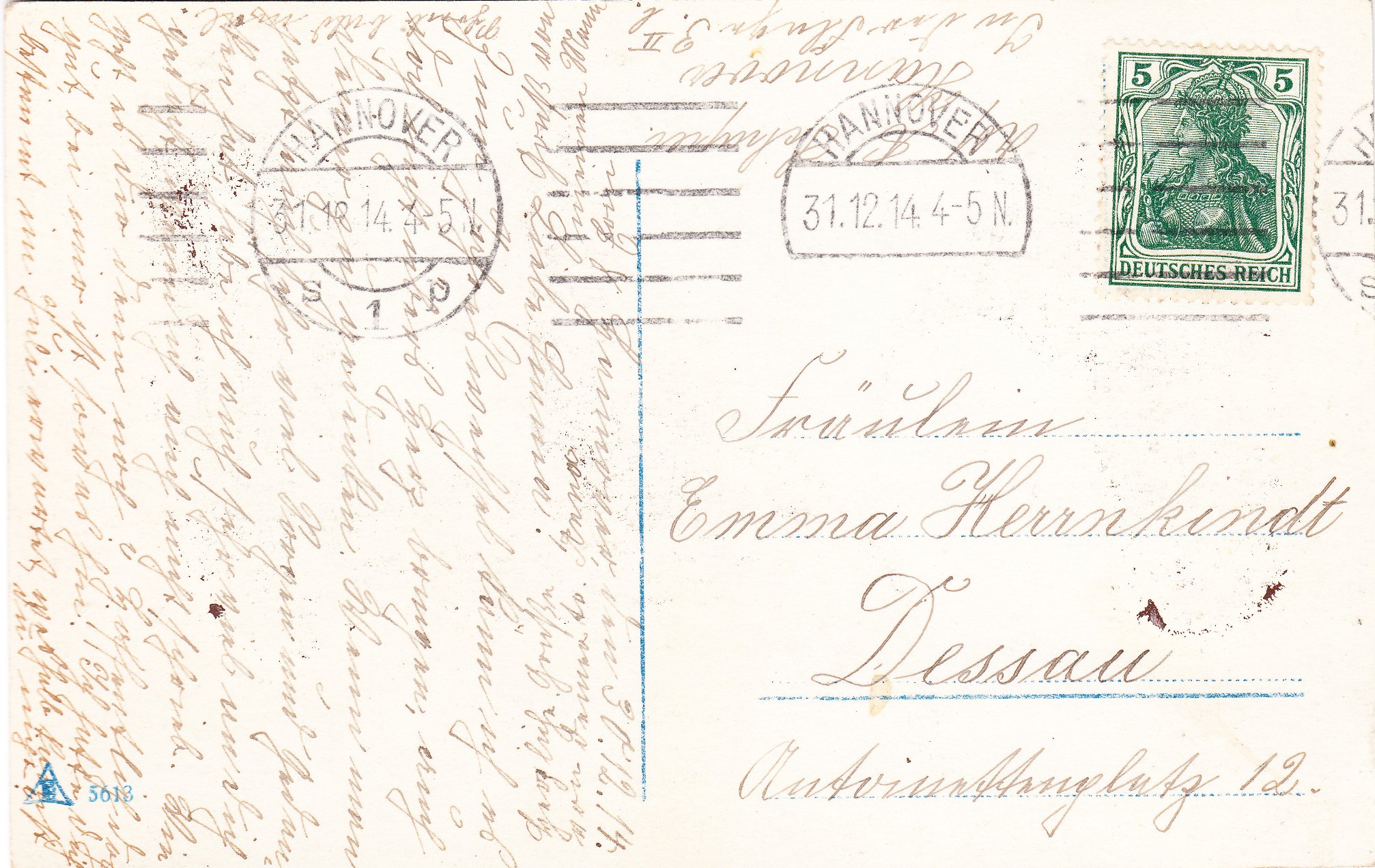 Diese am 30.12.1914 geschriebene Postkarte wurde am 31.12.1914 in Hannover mit einem Maschinenstempel entwertet: