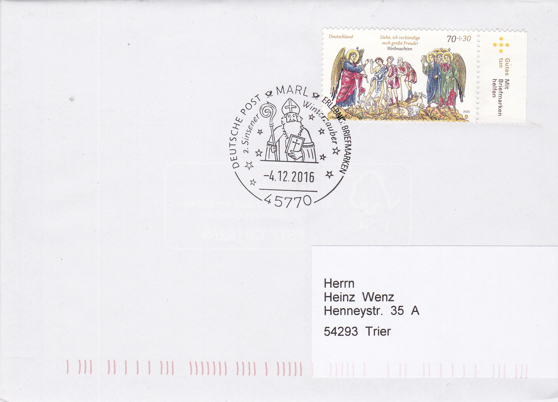 Sonderstempel aus Hamm vom 4.12.2016 zum 2.Sinsener Winterzauber mit St. Nikolaus im Stempelbild.