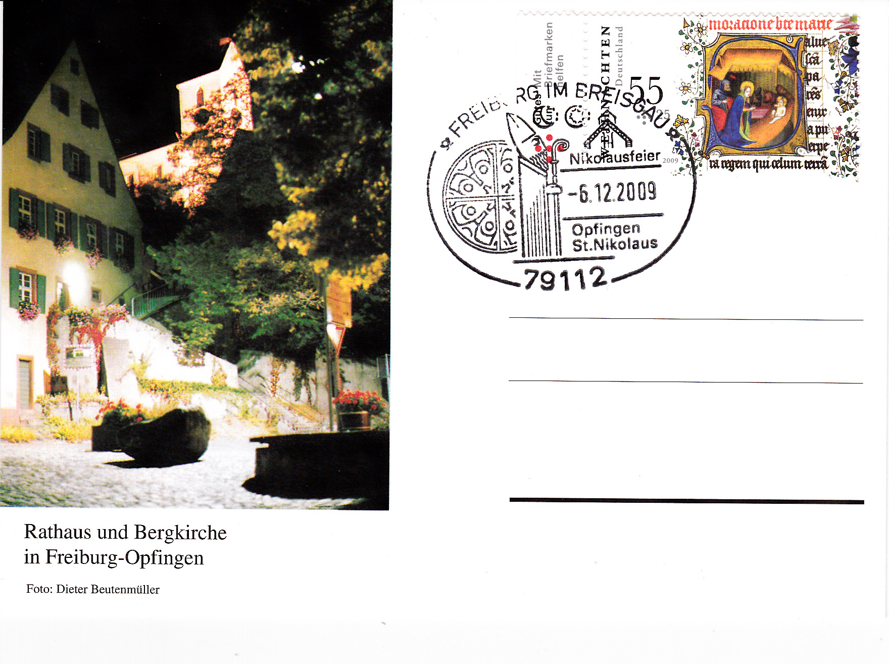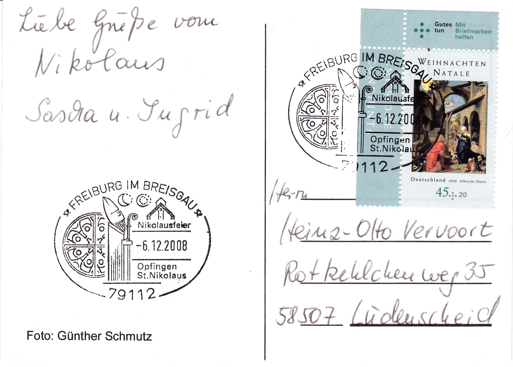 Sonderstempel vom 6.12.2008 aus Freiburg zur Nikolausfeier. Es ist dies der 25. Sonderstempel zum Nikolaustag in Opfingen St. Nikolaus (wie die Bildseite dieser Karte zeigt). Einige Stempelmotive wurden mehrere Jahre verwendet.