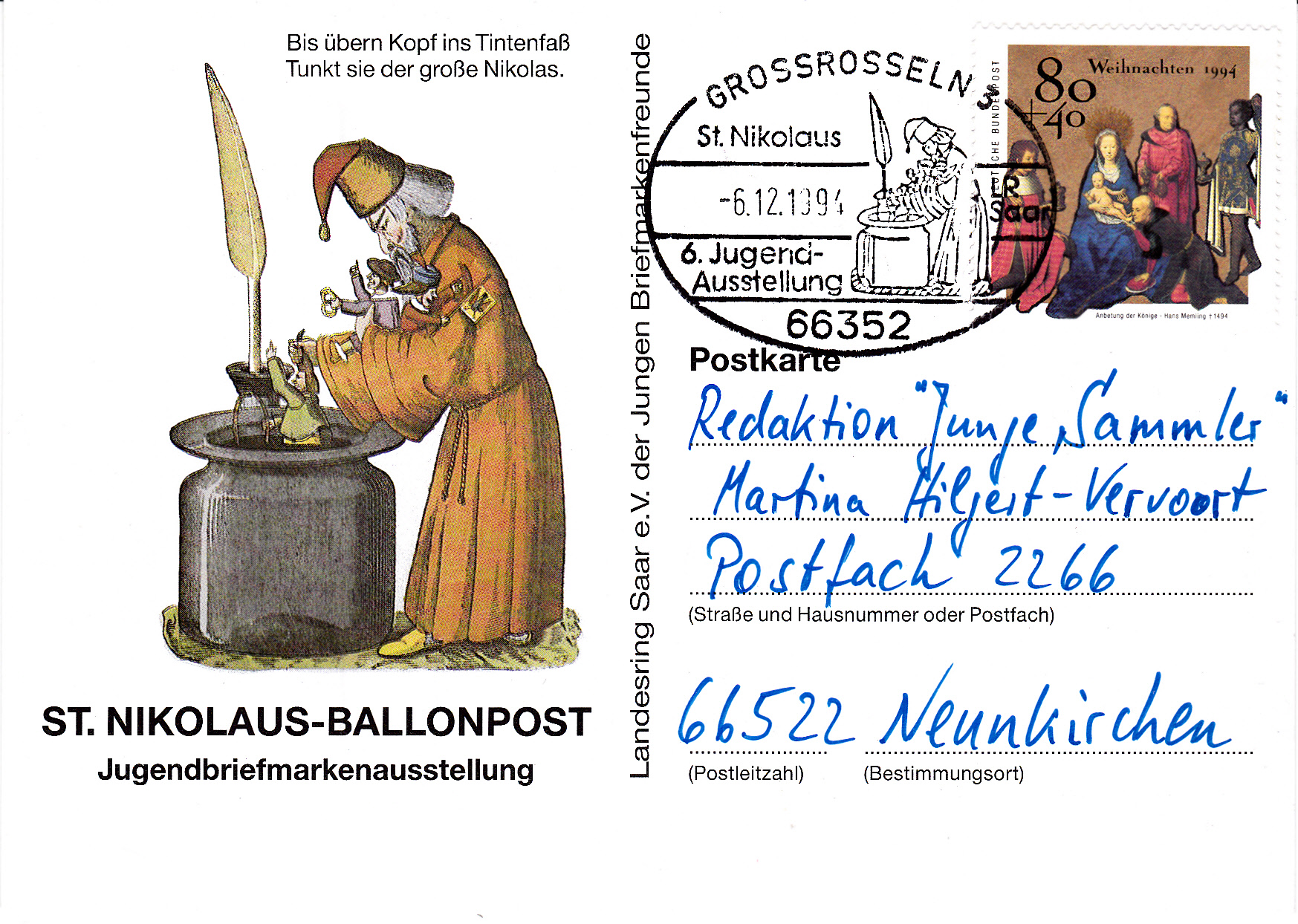 Im Jahre 1991 feierte das Nikolauspostamt in Grossrosseln - Ortsteil St. Nikolaus. Dies wurde auch im Sonderstempel zur Briefmarkenausstellung am 5./6.12.1991 dokumentiert. Hier ein Abschlag des Stempels vom 5.12.1991.