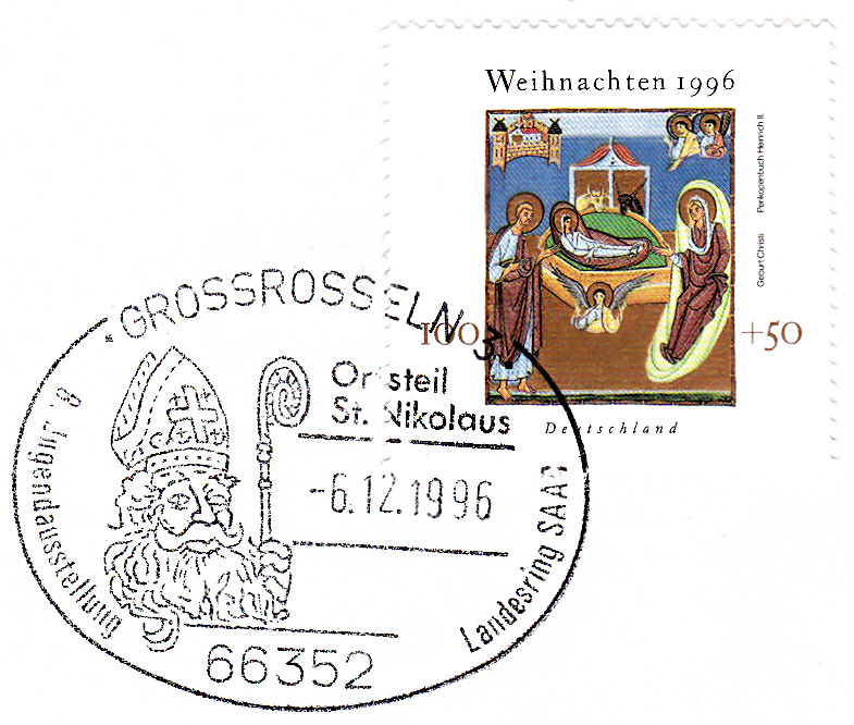 Der Sonderstempel vom 6.12.1996 aus Grossrosseln zeigt nur den Kopf von St. Nikolaus mit Mitra und Bischofsstab.
