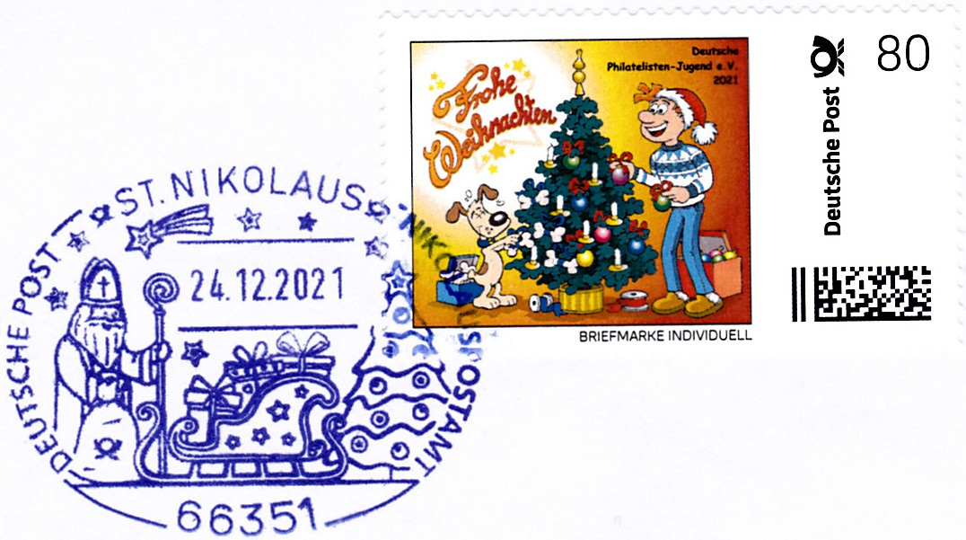 Dieser Sonderstempel aus St. Nikolaus vom 24.12.2021 Zeigt St.Nikolaus mit seinem Schlitten und einem Weihnachtsbaum im Stempelbild.