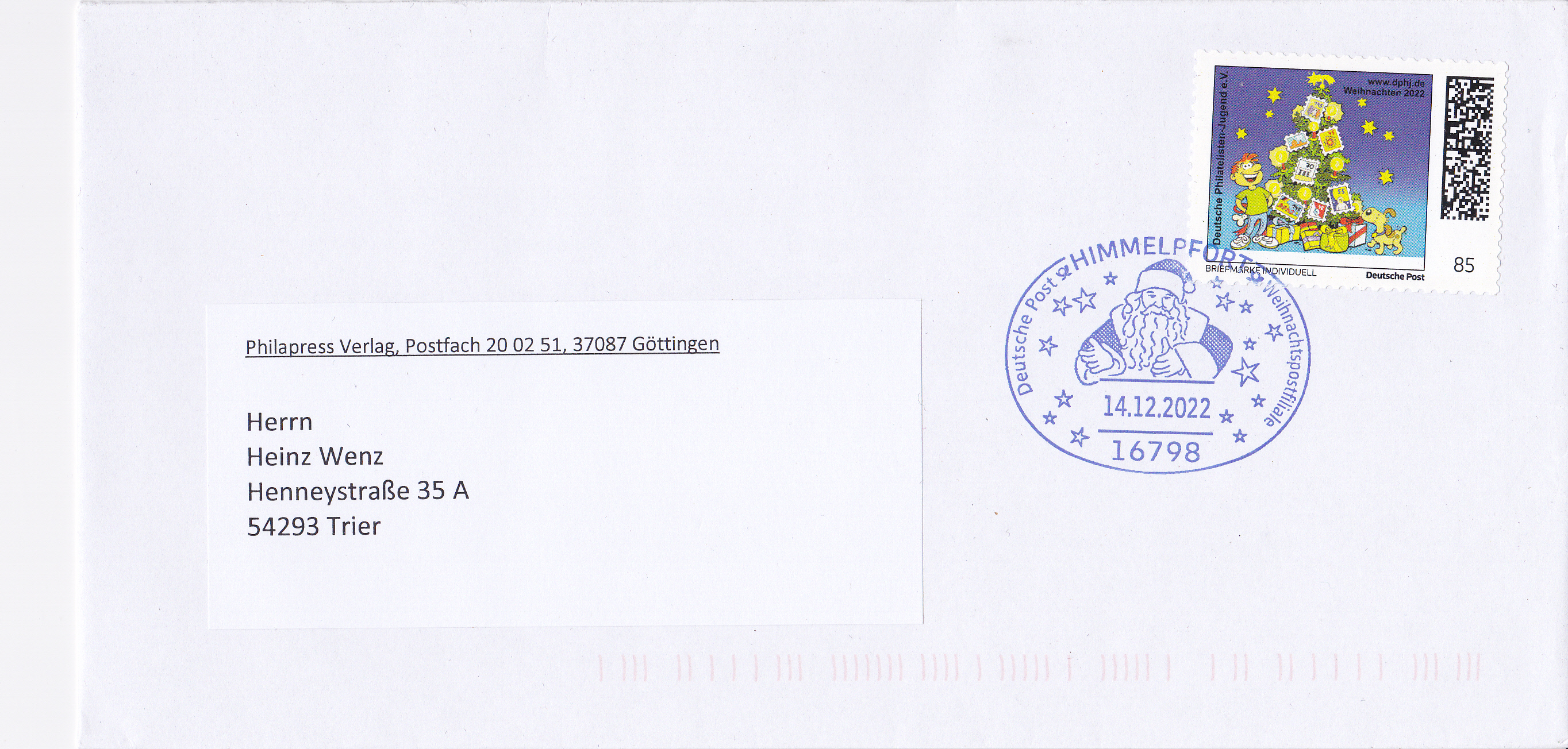 Und hier mit einem anderem Datum (14.12.2022) auf einem Brief mit einer Briefmarke individuell.