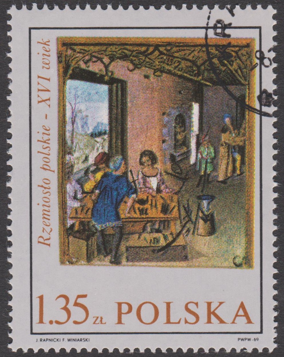 Zum Thema paßt auch Polen MiNr. 1965 mit dieser Miniaturmalerei "Beim Schnitzer" aus dem "Kodex von Behem", dem Gesetzbuch der Stadt Krakau von 1505: