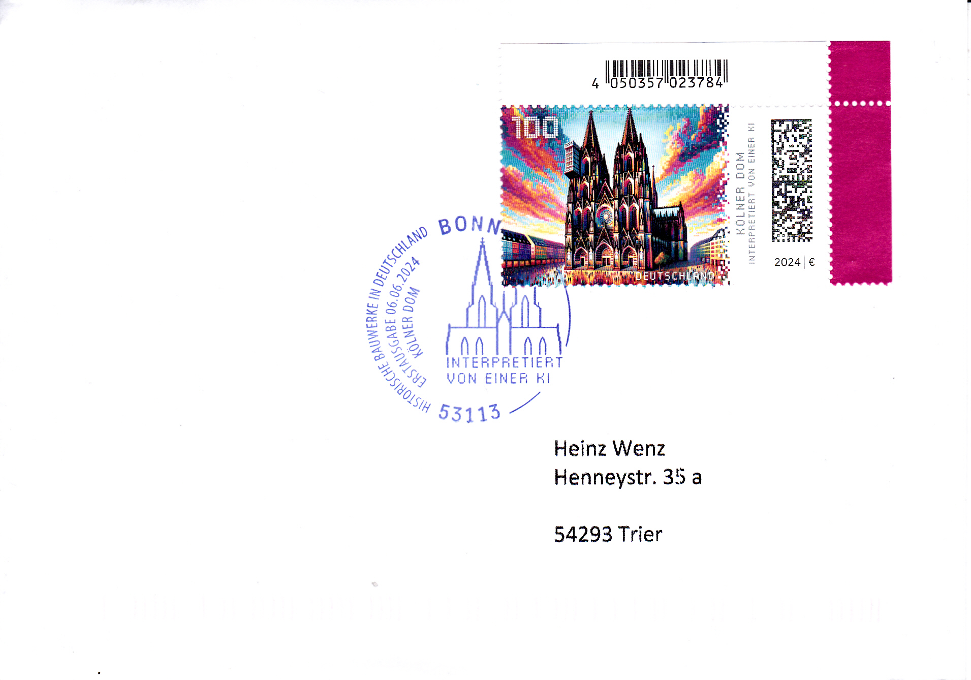 Die schon hier gezeigte Marke zur Weihe der Dresdner Frauenkirche (MiNr 2491) zeige ich jetzt auch mit dem Ersttagsonderstempel Bonn.