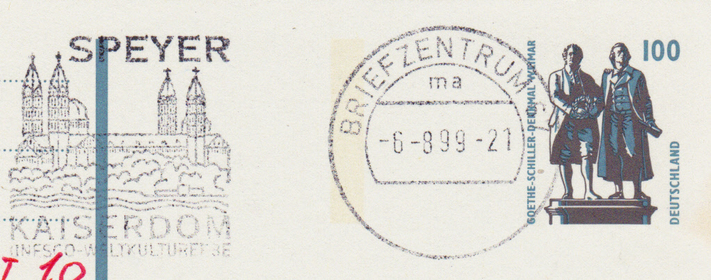 Dieser Maschinenwerbestempel aus dem Briefzentrum 67 vom 6.8.1999 zeigt im Werbeeinsatz den Kaiserdom zu Speyer.