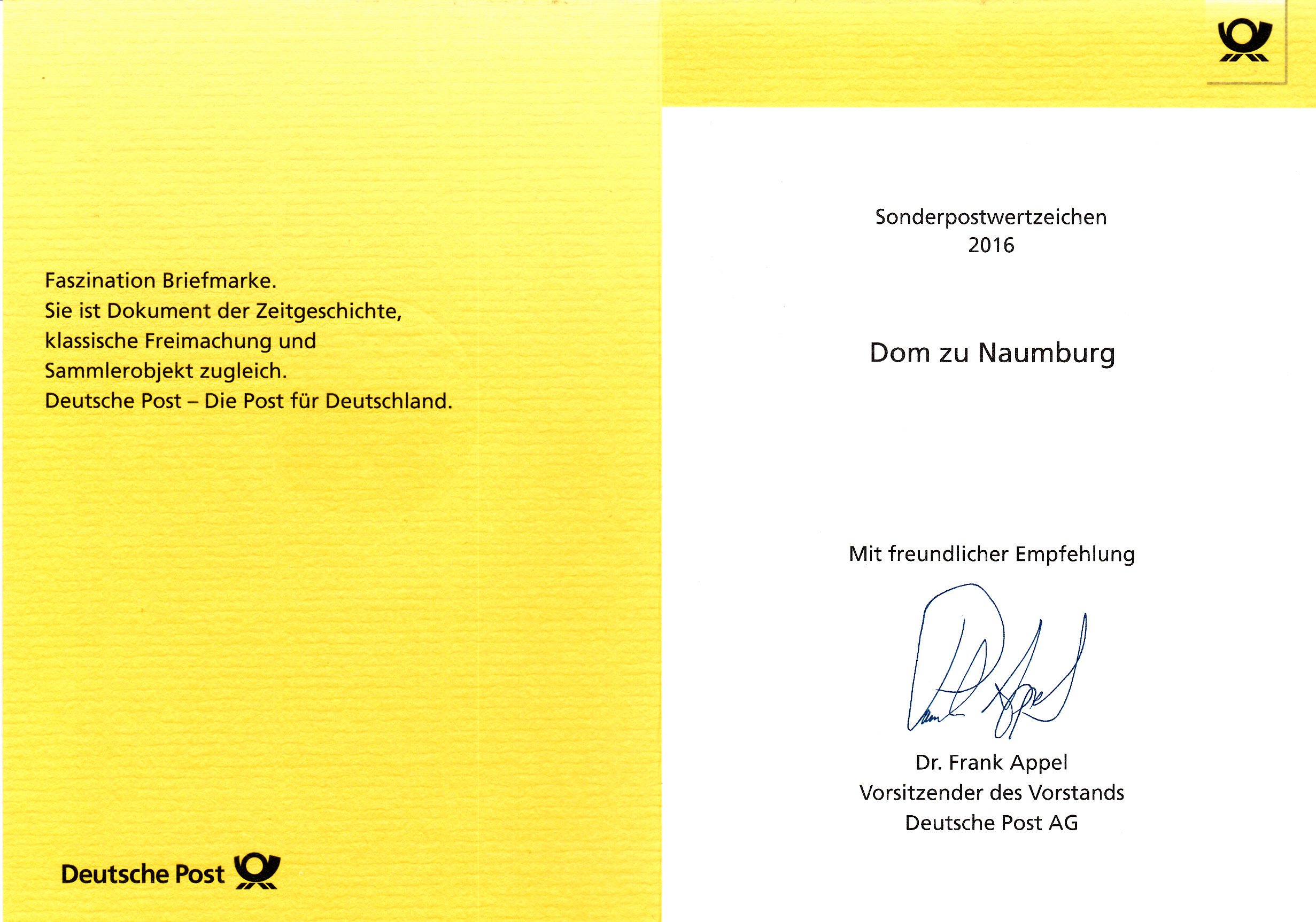 Auf der Sondermarke "Dom zu Naumburg" der Deutschen Post AG (MiNr 3264) wird eine Ansicht des Domes vor einem historischen Grundriss gezeigt.