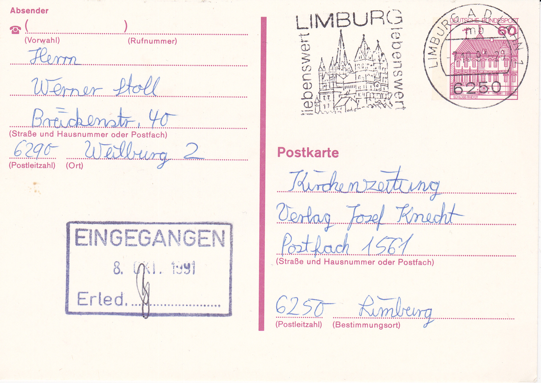 Ergänzend zu dem bereits gezeigten Maschinenwerbestempel mit dem Limburger Dom kann ich hier einen weiteren zeigen mit dem Textzusatz "Limburg liebenswert lebenswert", ebenfalls mit vierstelliger Postleitzahl, aber jetzt mit den Kennbuchstaben "mb".