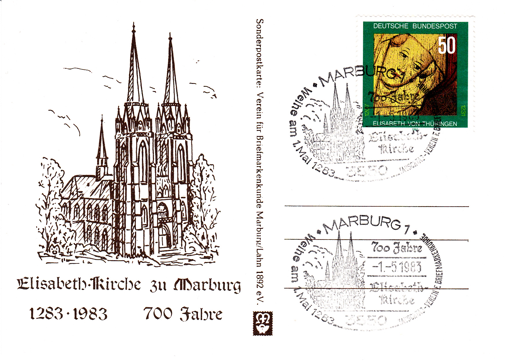 Die bereits hier beschriebene Elisabethkirche in Marburg wurde 1983 700 Jahre alt. Dazu wurde in Marburg am 1.5.1983 dieser Sonderstempel eingesetzt. Passend zum Namen der Kirche wurde eine Marke mit Elisabeth von Thüringen verklebt. Leider ist die Karte nicht echt gelaufen.