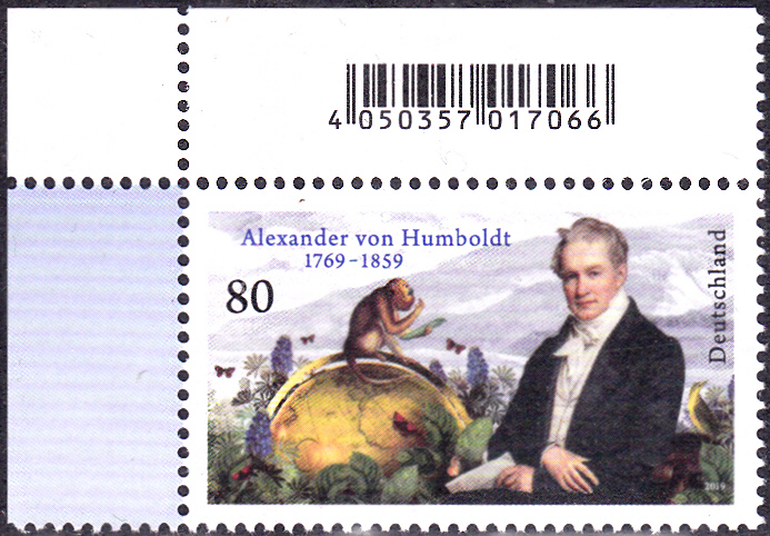 Zum 250. Geburtstag von Alexander von Humboldt ist bei der Deutschen Post eine Marke (MiNr 3492) mit seinem Porträt und einem Affe auf einem Globus. Hierzeige ich ein Marke vom Eckrand mit EAM-Codierung.