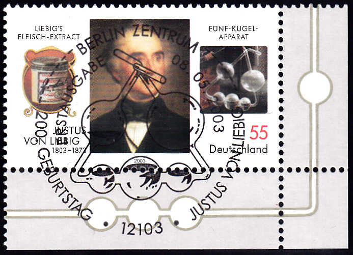 Zum 200. Geburtstag von Justus Freiherr von Liebig ist bei der Deutschen Post eine Marke (MiNr 2337) mit seinem Porträt und mit einer Dose Fleischextrakt sowie die von ihm 1831 entwickelte Fünf-Kugel-Apparat (ursprünglich Kali-Apparat genannt) zur Ermittlung der elementaren Zusammensetzung von tierischen und Pflanzenteilen.