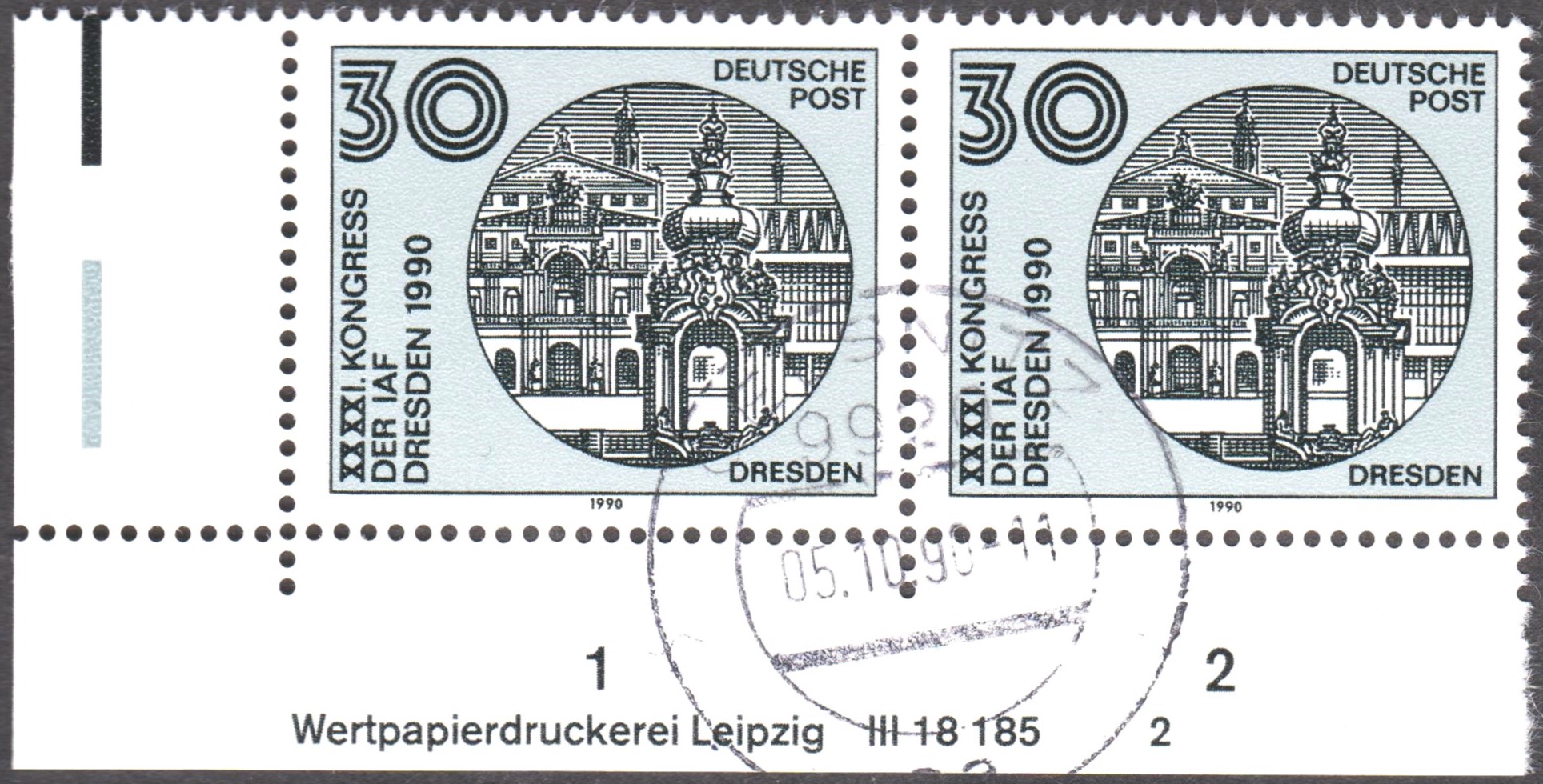 Zum XXXXI. KONGRESS DER IAF DRESDEN 1990 erschien am 02.10.1990 in einer Auflage von 6.000.000 Exemplaren DDR MiNr. 3360, das Bauwerke in Dresden zeigt.