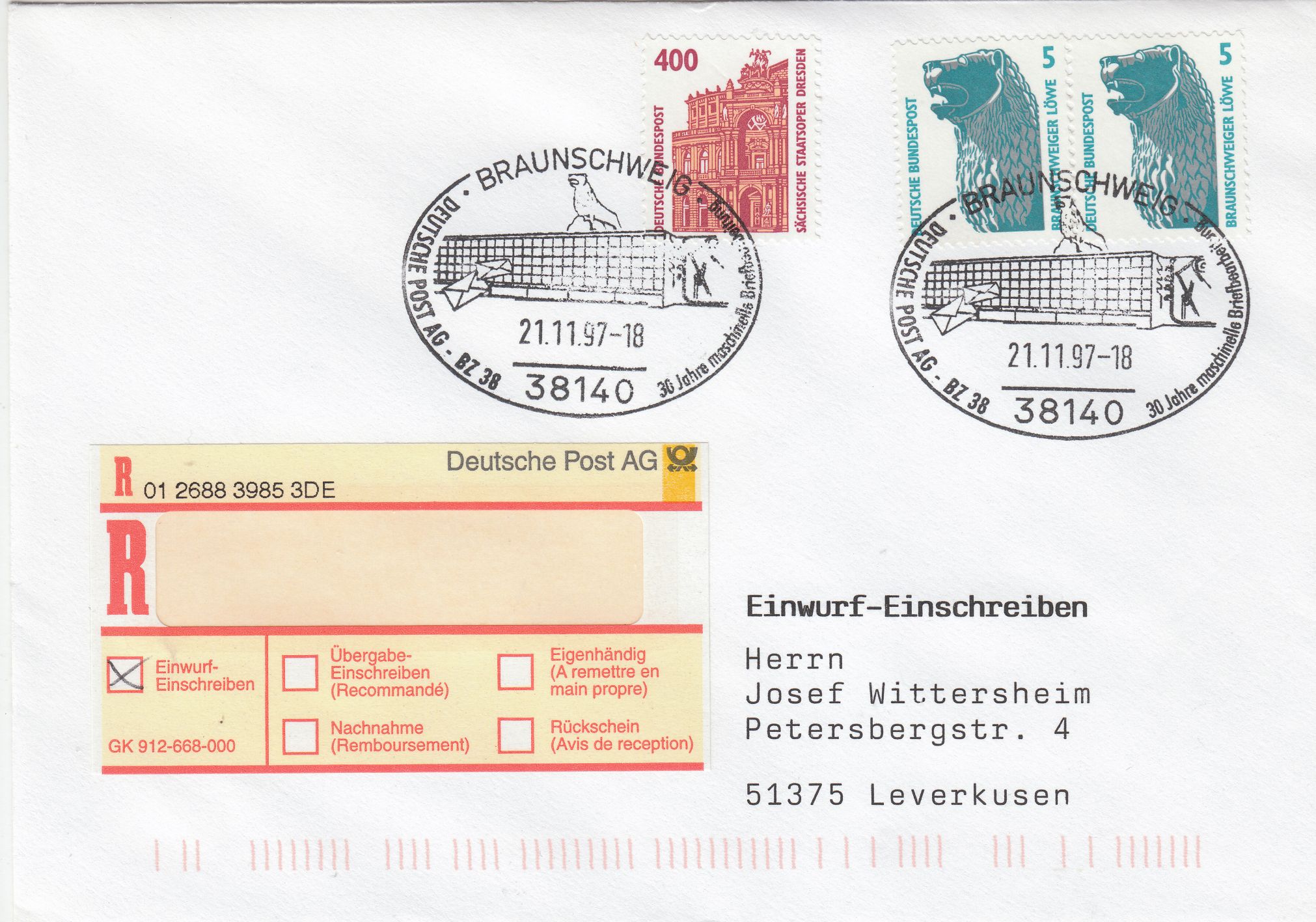 Die Wertstufe zu 5 Pfennig der Dauerserie SWK zeigt lediglich den Kopf des "Braunschweiger Löwen", hier zwei Exemplare von der Rolle mit waagerechter Zählnummer "400" sowie "410" in MiF mit einem Exemplar der Wertstufe 400 Pf der Dauerserie SWK portorichtig auf Standardbrief (110 Pf) per "Einwurf-Einschreiben" (300 Pf). Dieser Beleg wurde am 21.11.1997 in BRAUNSCHWEIG mit einem Handwerbestempel entwertet, der als Motiv den "Braunschweiger Löwen" komplett zeigt: