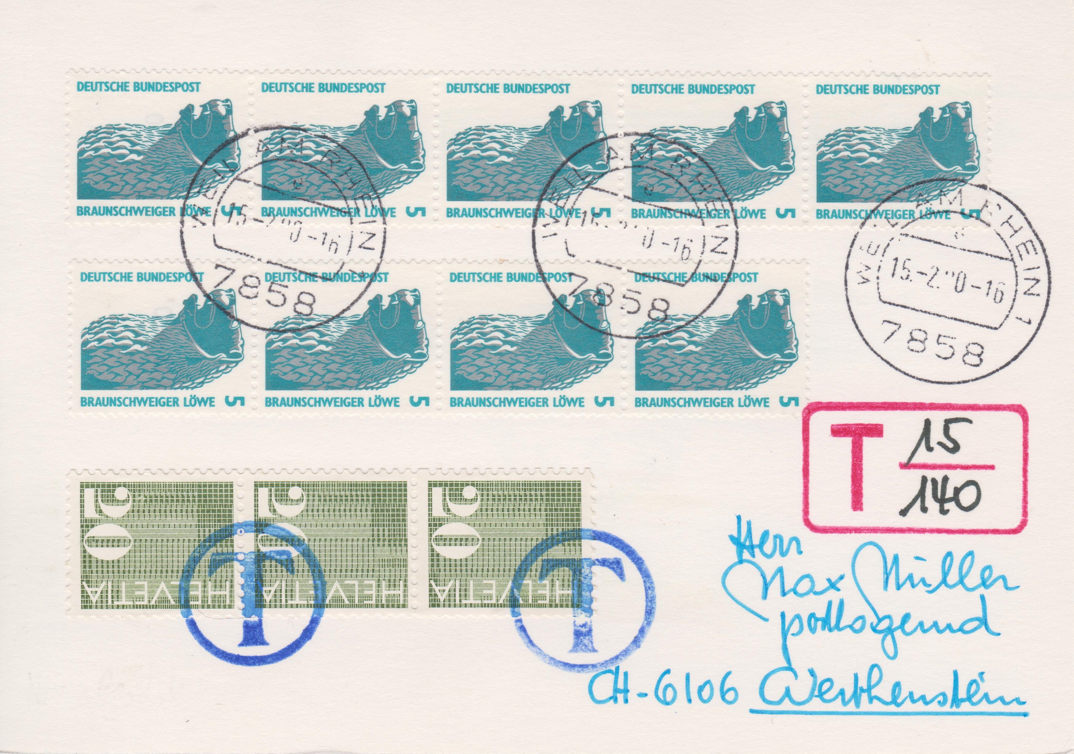 In der Schweiz wurde dieser Bruch 40/140 mit dem Porto eines Briefes ins Ausland multipliziert und es wurden 80 Rappen in Form von drei Freimarken unterschiedlicher Wertstufen verklebt und per T-tempel (= Taxstempel) entwertet.