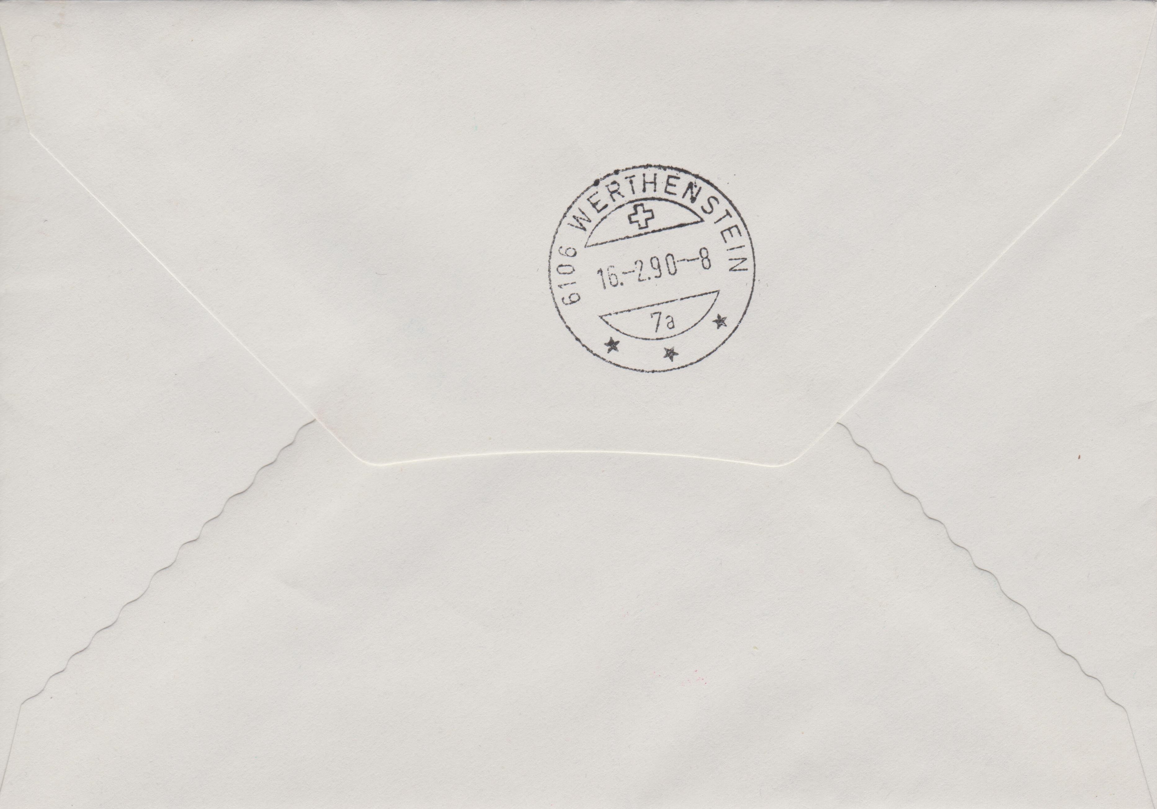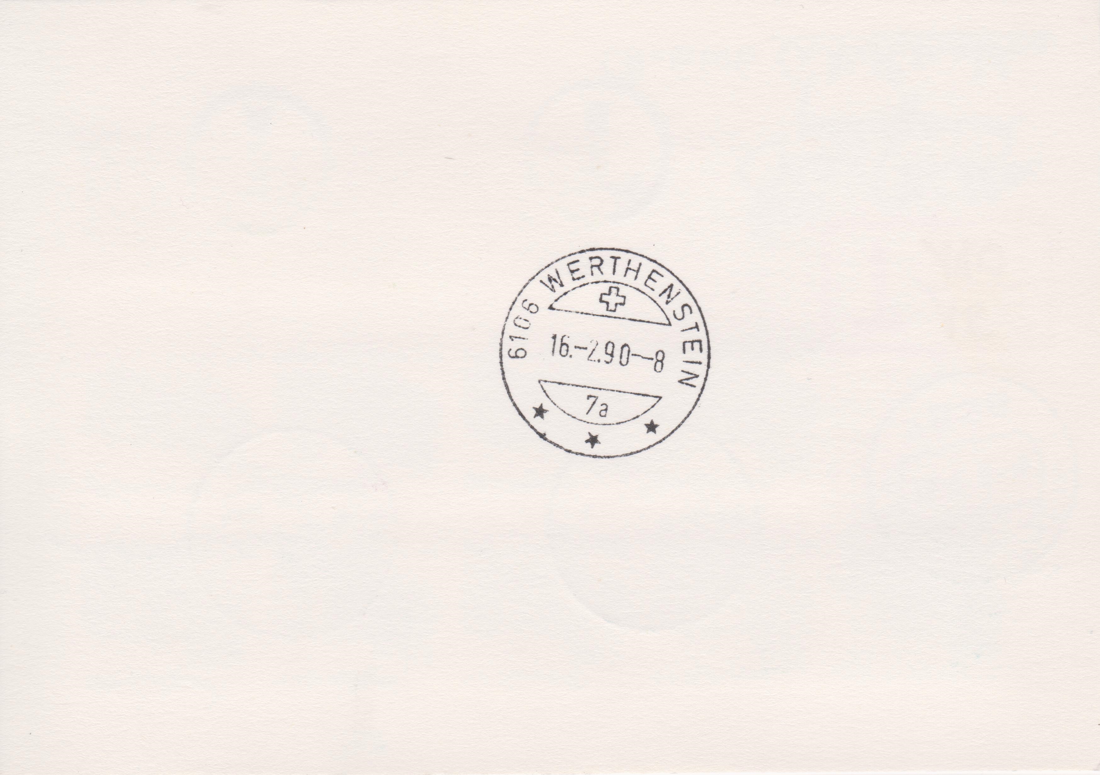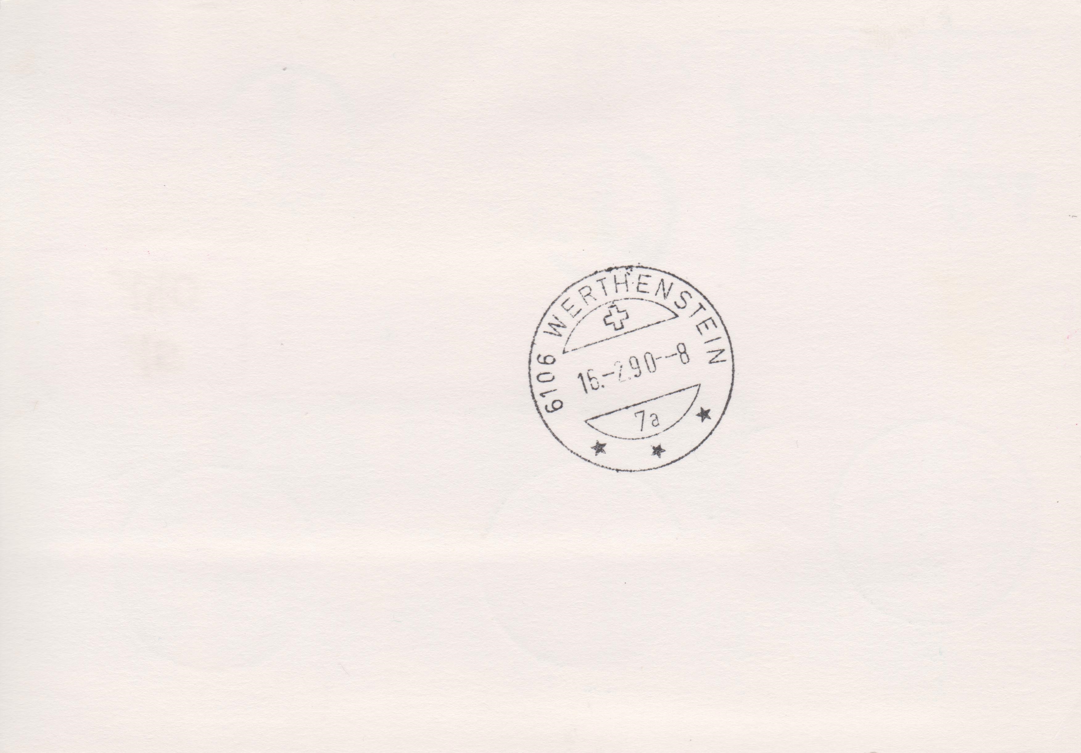 Diese Postkarte kam am 16.02.1990 an Ihrem Bestimmungsort 6106 WERTHESTEIN an, was ein rückseitig abgeschlagener Ankunftstempel dokumentiert:
