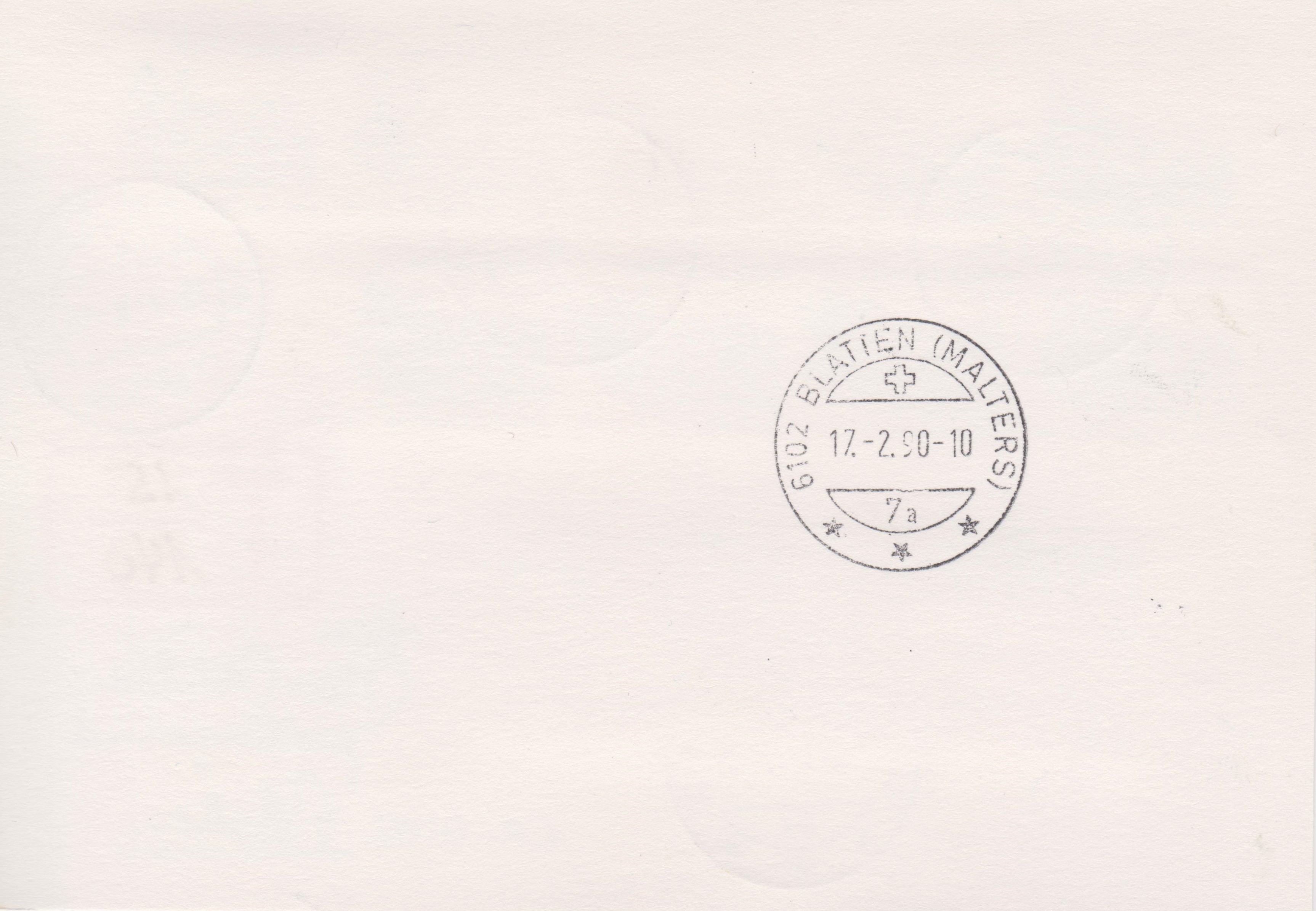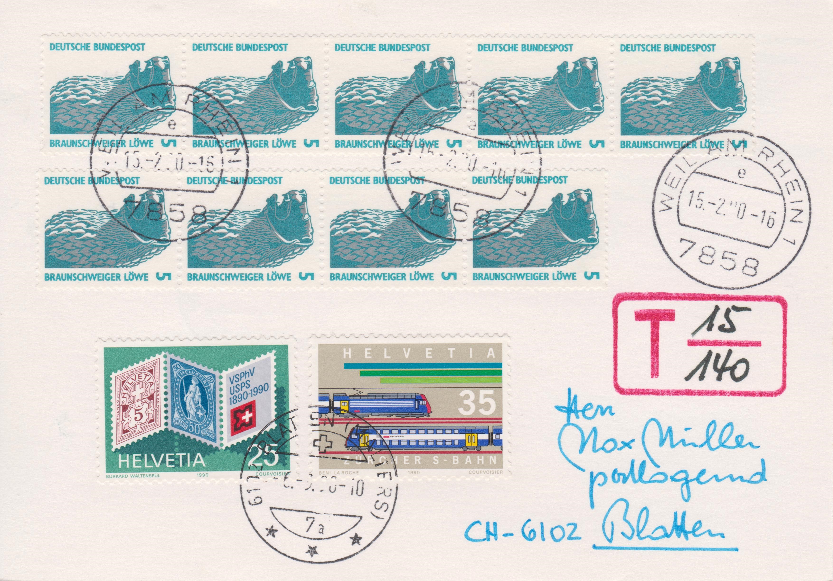 In der Schweiz wurde dieser Bruch 15/140 mit dem Porto eines Briefes ins Ausland multipliziert und es wurden 60 Rappen in Form von zwei Sondermarken verklebt und am 06.03.1990 per Tagesstempel entwertet.
