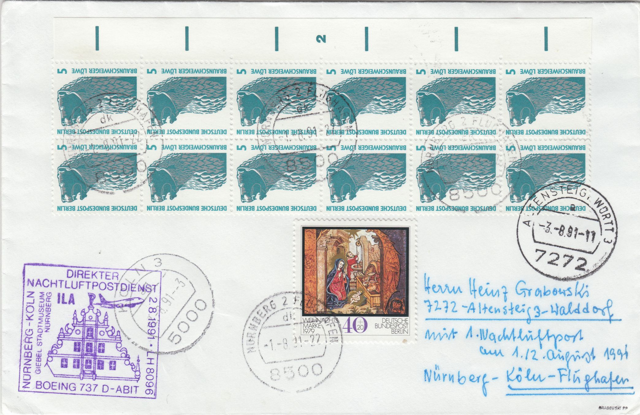 Zwölferblock der Wertstufe 5 Pf vom linken Rand mit Bogenzählnummern "454715" auf Standardbrief (100 Pf) in MiF mit einer Weihnachtsmarke 1979 Berlin der Wertstufe 40 Pf, am 01.08.1991 ab NÜRNBERG 2 FLUGHAFEN, laut Flugbestätigungsstempel befördert mit der ersten Nachtluftpost LH 8096 per BOEING 737 D-ABIT vom 01.08.1991 auf den 02.08.1991 von Nürnberg nach Köln, wo am 02.08.1991 um 3 Uhr früh ein Tagesstempel als Ankunftsstempel abgeschlagen wurde. Der Beleg wurde dann an seinen Bestimmungsort ALTENSTEIG weitergeleitet, wo am 03.08.1991 um 11 Uhr ein Tagesstempel abgeschlagen wurde.