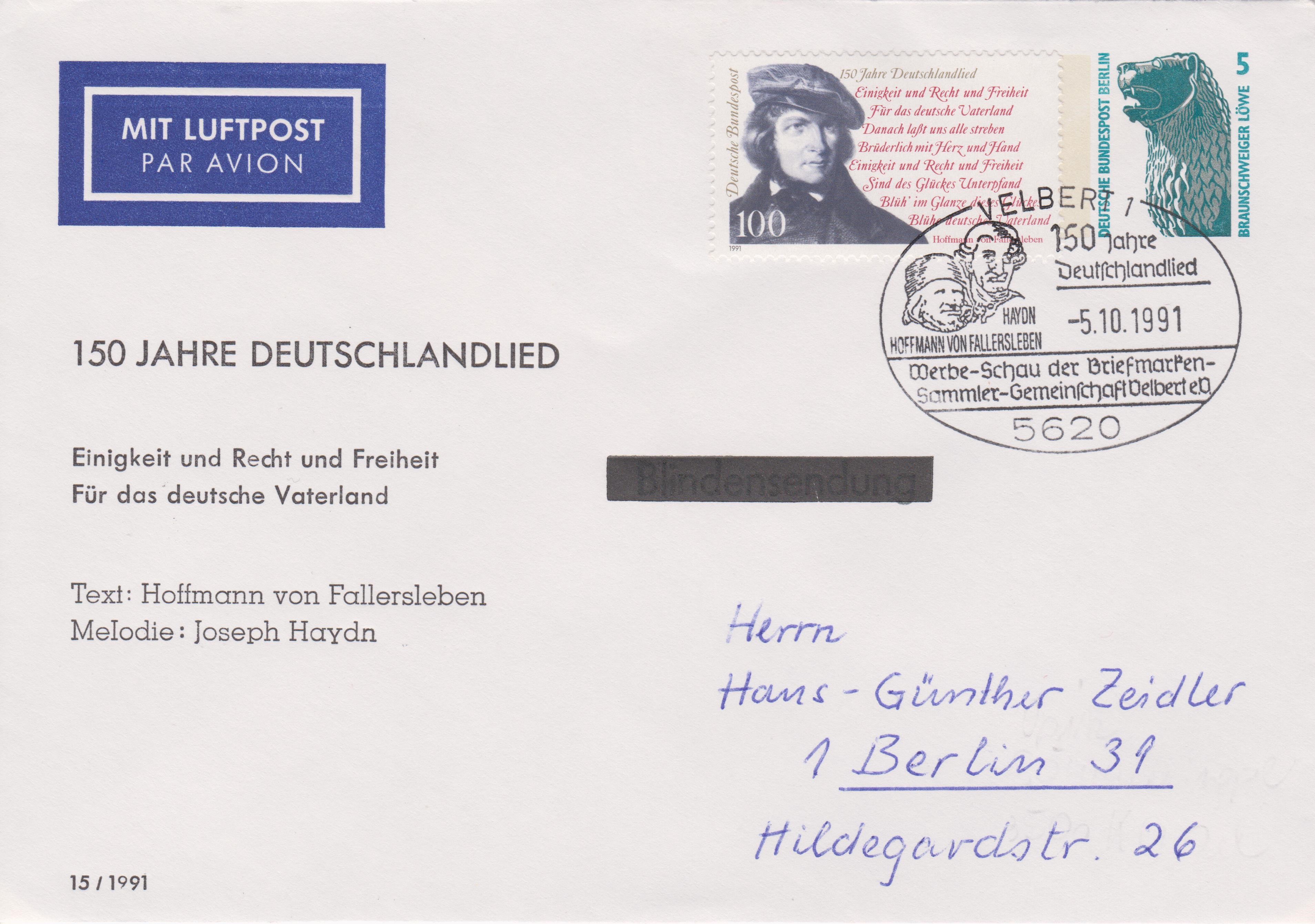 Privatganzsache Berlin PU 151 mit Druckvermerk "15/1991" mit Zusatzfrankatur am 05.10.1991 als Brief, 100 Pf, per Inlands-Luftpost, 5 Pf, gelaufen von 5620 VELBERT nach Berlin:
