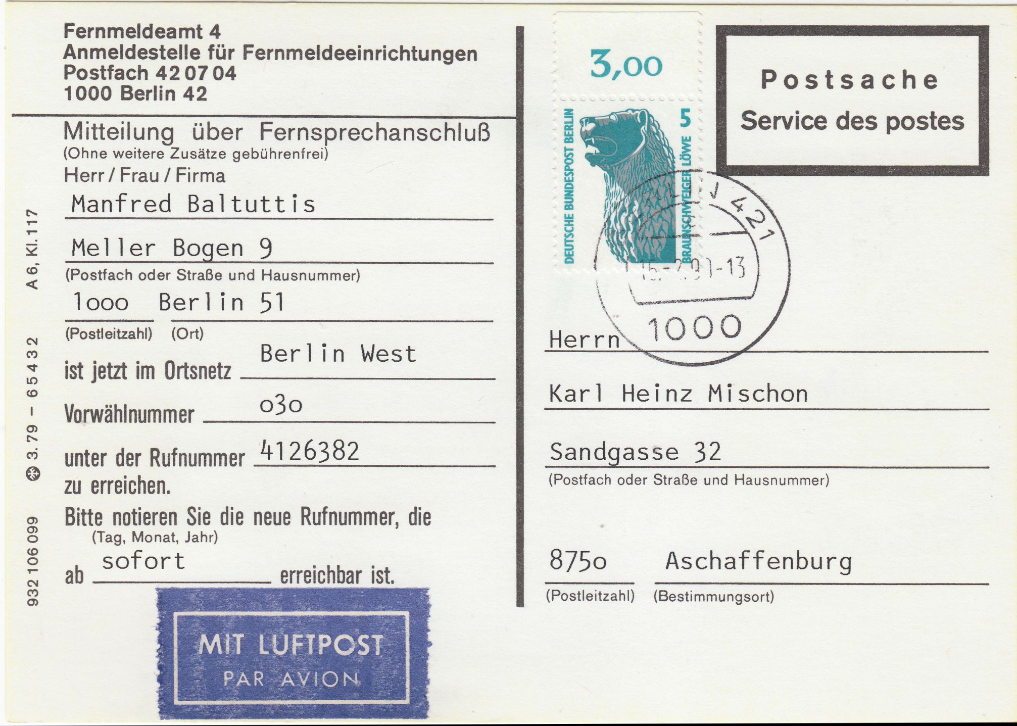 EF der Wertstufe 5 Pf am 15.02.1990 als Erstausgabetag portorichtig zur Abdeckung der Luftpostgebühr auf einer ansonsten gebührenfreien Postsache in Kartenform, hier als Oberrandstück mit Reihenwertzähler "3,00" = Feld 6.