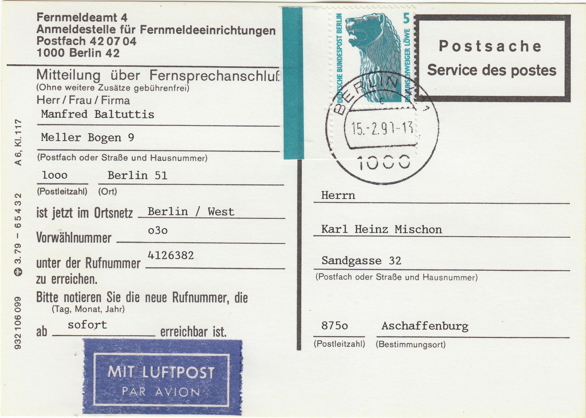 EF der Wertstufe 5 Pf am 15.02.1990 als Erstausgabetag portorichtig zur Abdeckung der Luftpostgebühr auf einer ansonsten gebührenfreien Postsache in Kartenform, hier als Eckrandstück unten links, Feld 91.