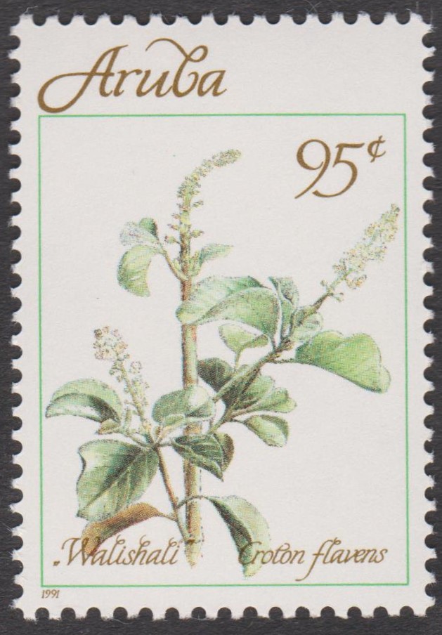 Aruba MiNr. 94 erschien am 29.05.1991 zum Thema "Heilpflanzen" und zeigt Croton flavens: