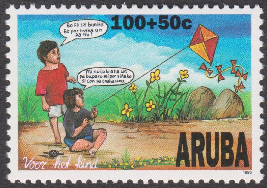 Aruba MiNr. 187 erschien am 24.10.1996 im Rahmen eines Satzes "Jugendwohlfahrt: Cartoons ", 100 + 50 C, und zeigt das Motiv "Jungen lassen Drachen steigen":