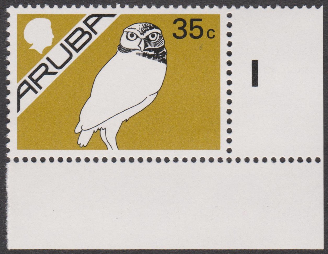 Am 05.02.1986 erschien zum Thema "Gebäude, Tiere und Leben auf Aruba" diese Freimarke in der Wertstufe 35 c, Aruba MiNr. 8, hier eine rechte obee Bogenecke: