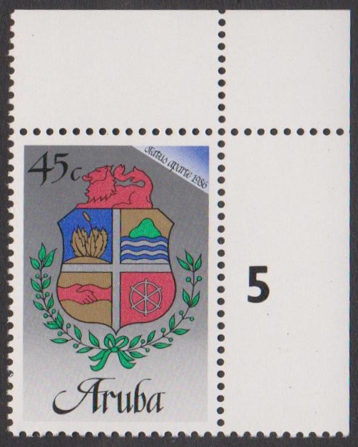 Aruba MiNr. 2, hier eine rechte obere Bogenecke, zeigt das Staatswappen von Aruga: