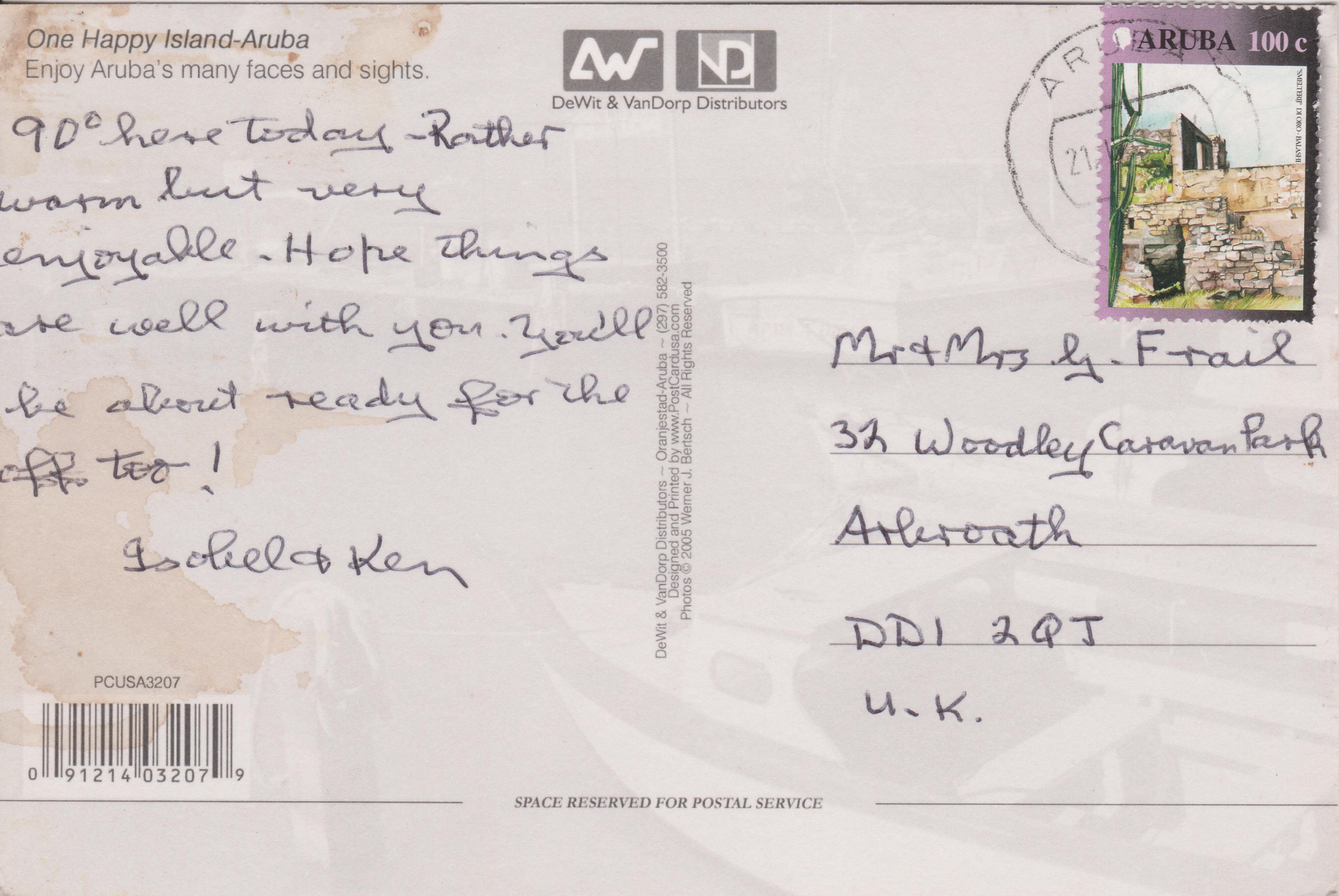 Diese Freimarke der Wertstufe 100 C, Aruba MiNr. 279, zeigt die "Goldmine, Balashi", hier als Einzelfrankatur auf einer Ansichtskarte: