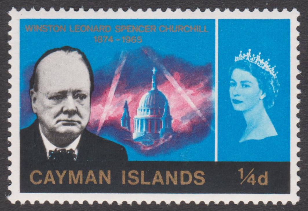 Dieses Postwertzeichen Cayman Islands MiNr. 177 zeigt den britischen Premierminister Winston Spencer Churchill vor der von Feuerschein umgebenen St.-Pauls-Kathedrale in London: