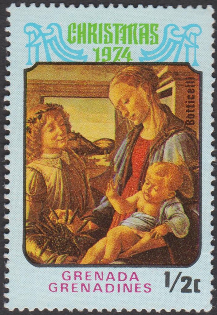 Grernada/Grenadinen MiNr. 36 "Weihnachten: Madonnengemälde" erschien am 27.11.1974 und zeigt ein Gemälde von Sandro Botticelli: