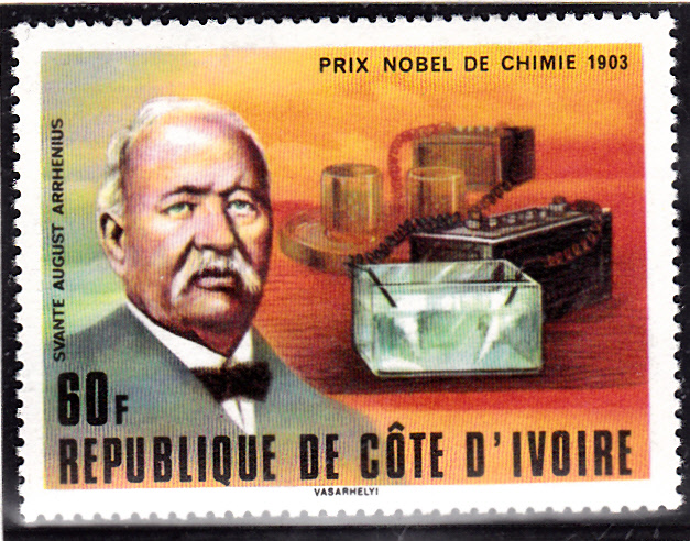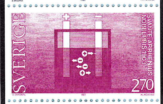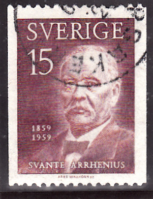 In Schweden ist 1963 eine Marke erschienen, die auch ein Porträt von Svante Arrhenius zeigt. Hier diese Marke aus der Rolle (MiNr 513 A). Diese Marke gibt es auch dreiseitig gezähnt aus Markenheftchen (MiNr 513 Dl und 513 Dr).
