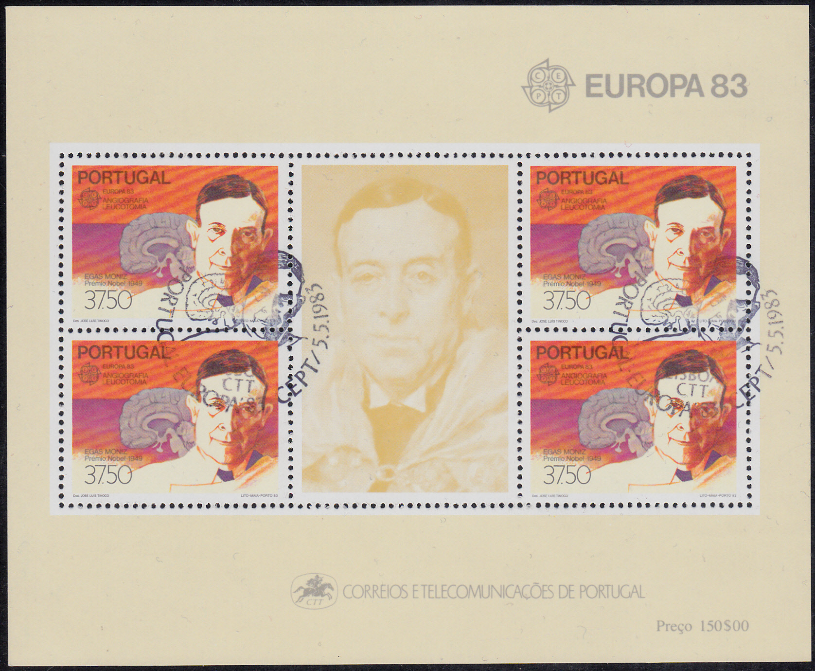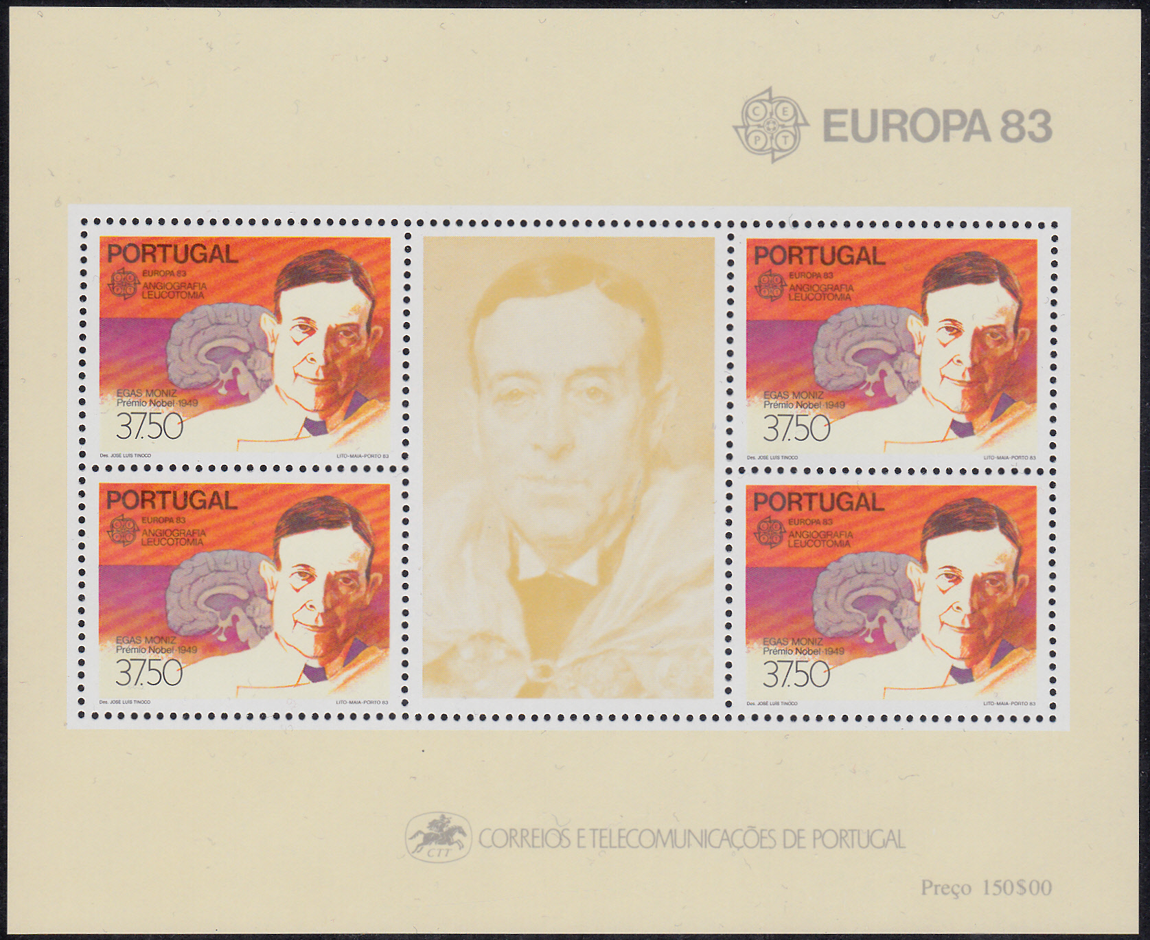 In Portugal erschien die Europamarke 1983 zum Thema "Große Werke des menschlichen Geistes" (MiNr 1601) mit einem Porträt von António Egas Moniz.