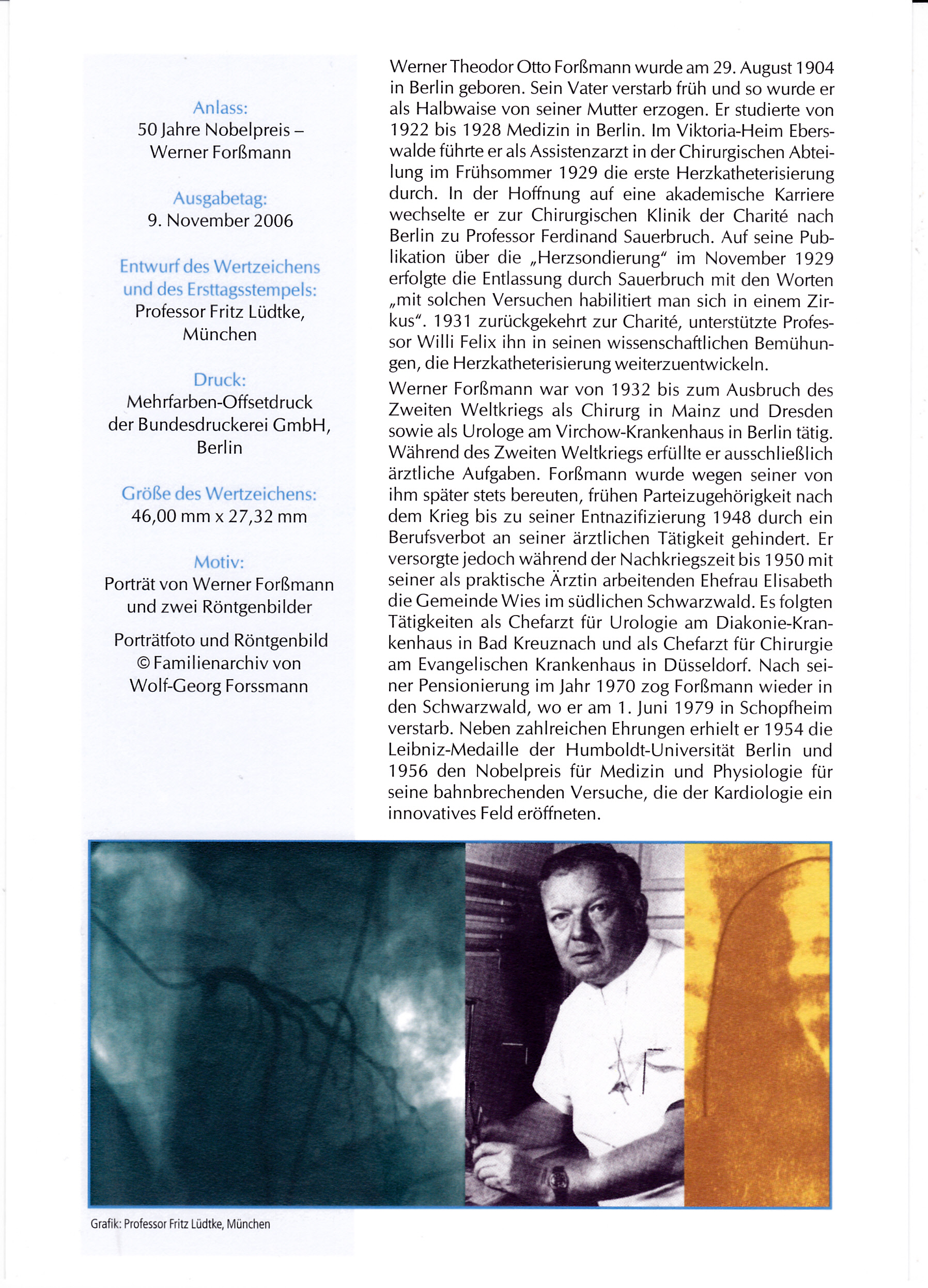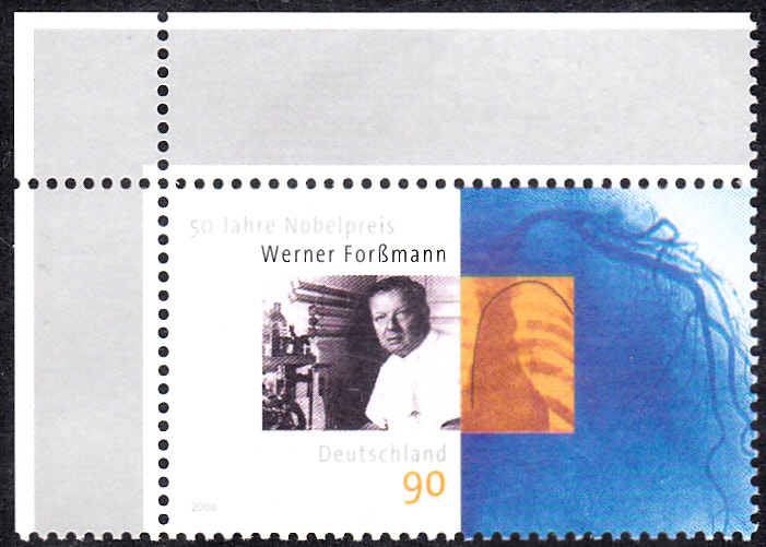 50. Jahrestag der Verleihung des Nobelpreises für Medizin an Werner Forßmann erschien bei der Deutschen Post eine Sondermarke (MiNr 2573). Hier ein Eckrandstück der Marke: