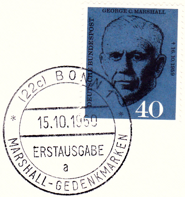 Zum 1. Todestag von George C. Marshall erschien bei der Deutschen Bundespost am 15.10.1960 diese Marke (MiNr 344) seinem Porträt.